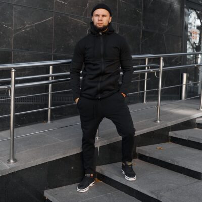 Мужской Ветрозащитный Спортивный Костюм Черного Цвета с Цветными Вставками – Олимпийка + Штаны Джоггеры