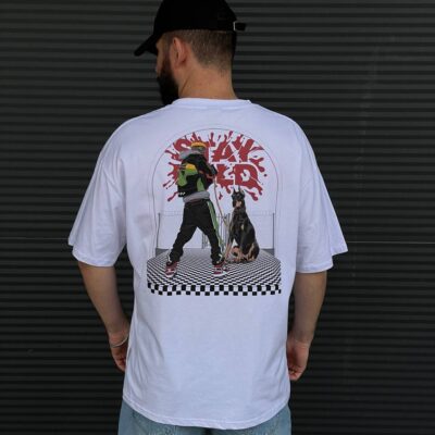 Мужской Белый Свитшот Оверсайз с Надписями и Круглым Вырезом – Утепленный на Флисе