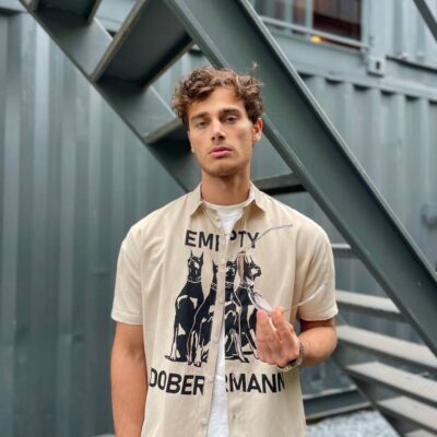 Мужское Хлопковое Бежевое Худи Варенка Оверсайз с Ярким Принтом и Кулиской на Капюшоне
