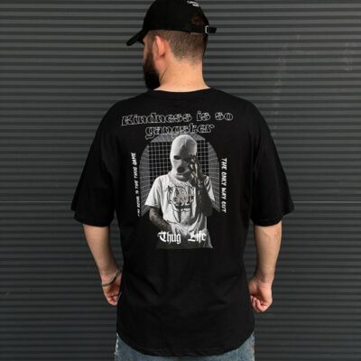 Мужское Хлопковое Черное Худи Варенка Оверсайз с Ярким Принтом и Кулиской на Капюшоне
