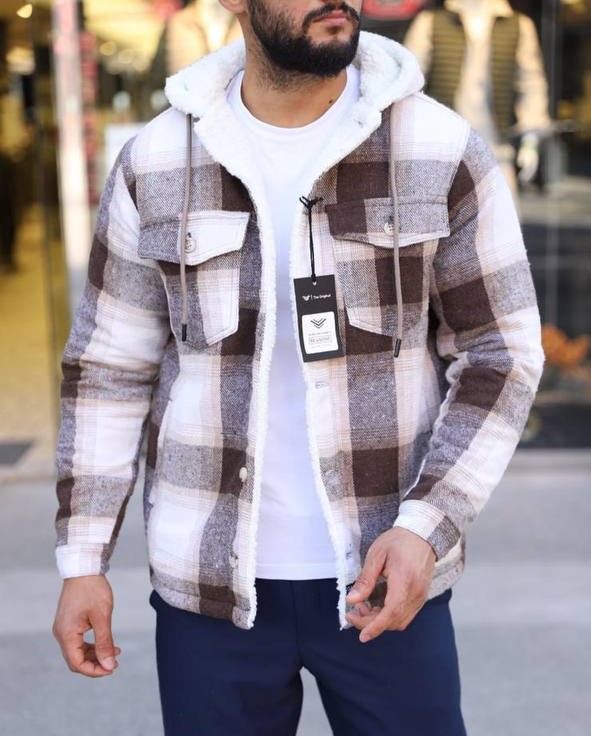 Мужская Бело-Коричневая Рубашка в Клеточку – Утепленная на Овчине с Капюшоном