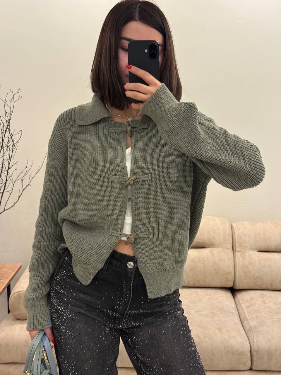Женский Зеленый Кардиган Оверсайз – Свободного Кроя с Жемчужными Пуговицами