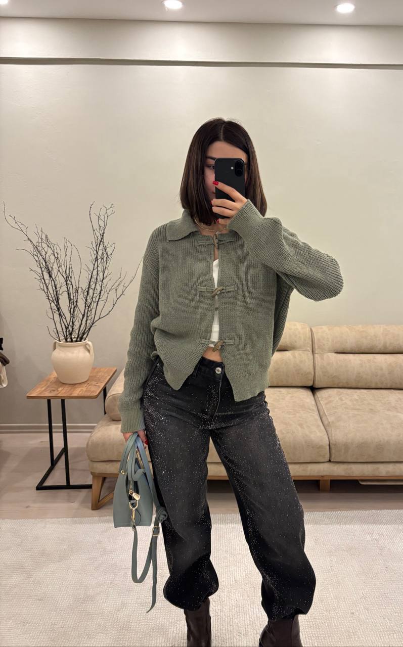 Женский Зеленый Кардиган Оверсайз - Свободного Кроя с Жемчужными Пуговицами