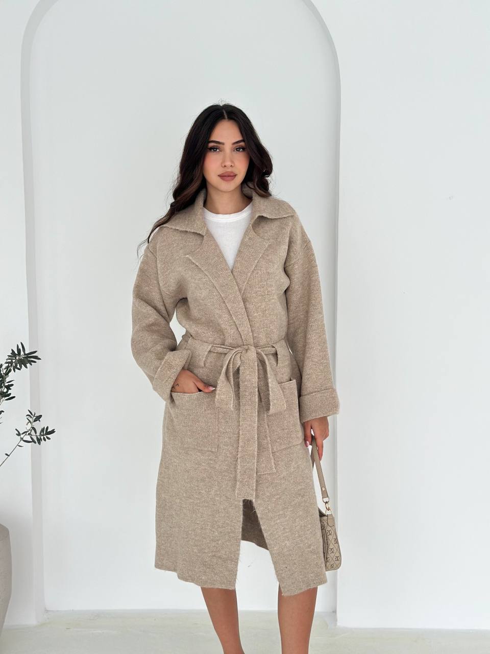 Женский Молочный Вязаный Кардиган до Колен с Поясом
