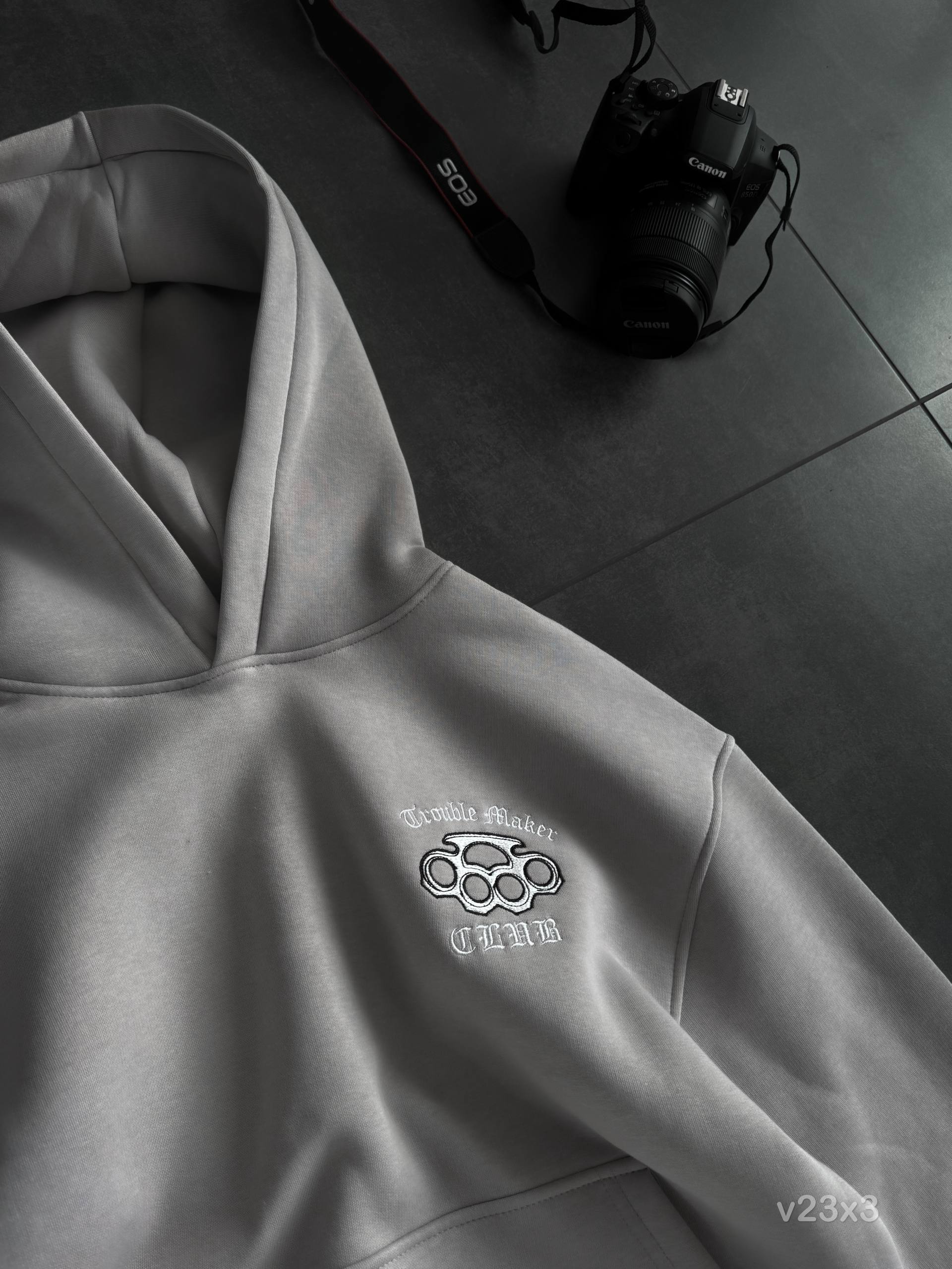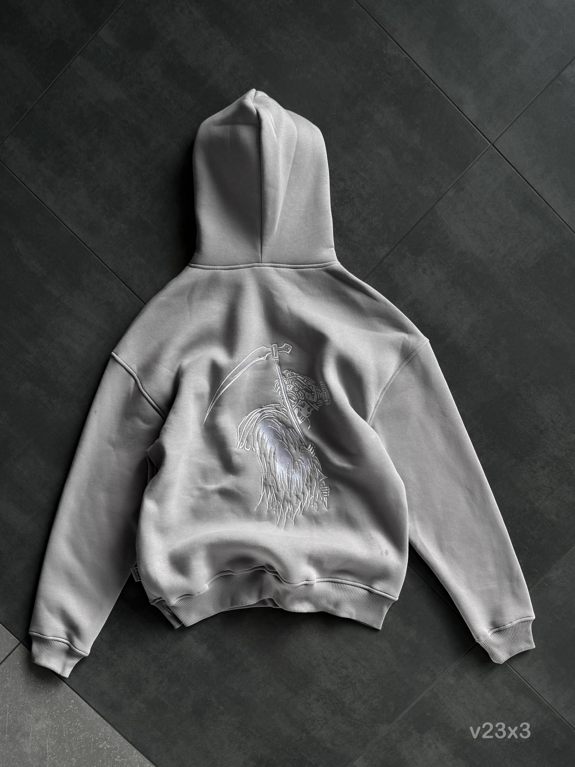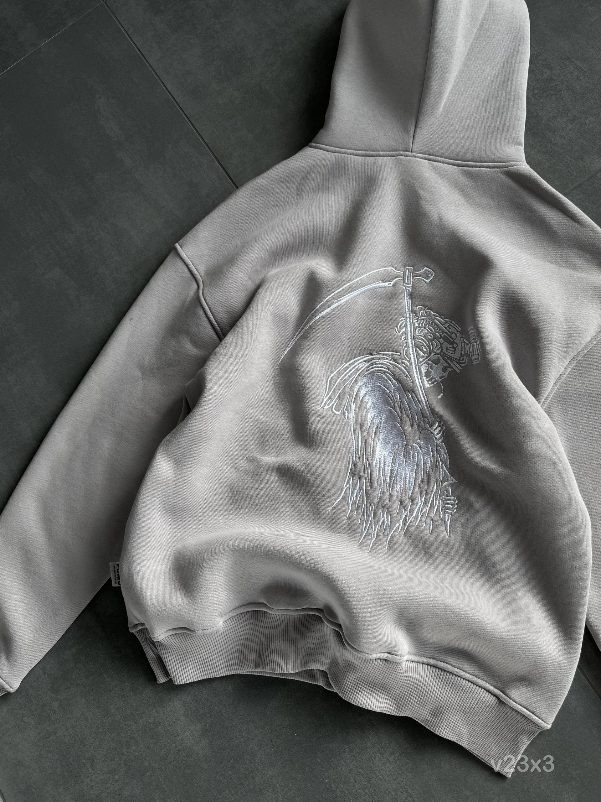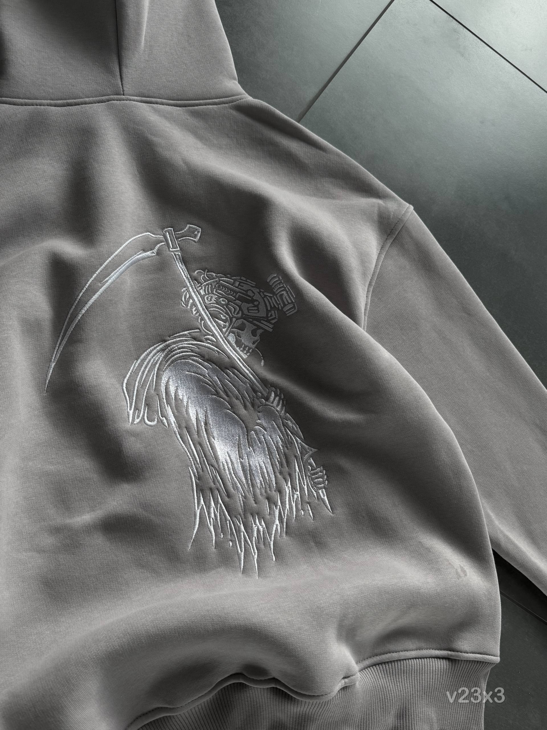Мужское Утепленное Серое Худи на Флисе – Свободного Кроя с Вышивкой на Спине