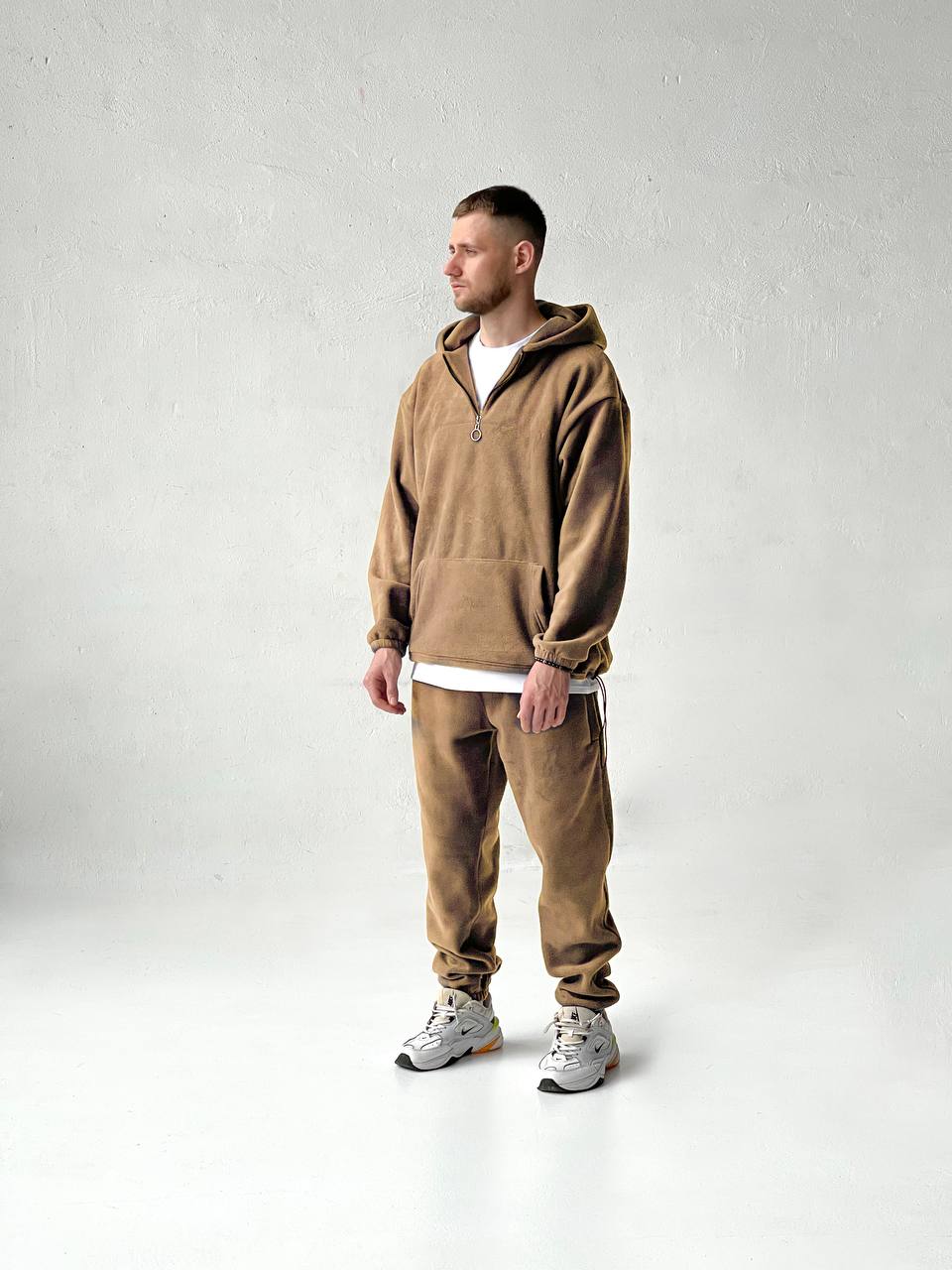 Мужской Теплый Флисовый Бежевый Костюм Свободного Кроя – Худи с Короткой Змейкой + Штаны Джоггеры