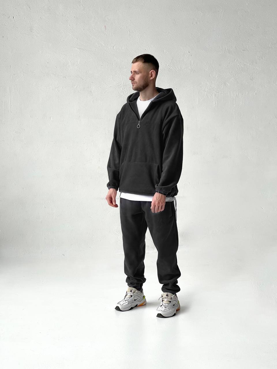 Мужской Теплый Флисовый Черный Костюм Свободного Кроя – Худи с Короткой Змейкой + Штаны Джоггеры
