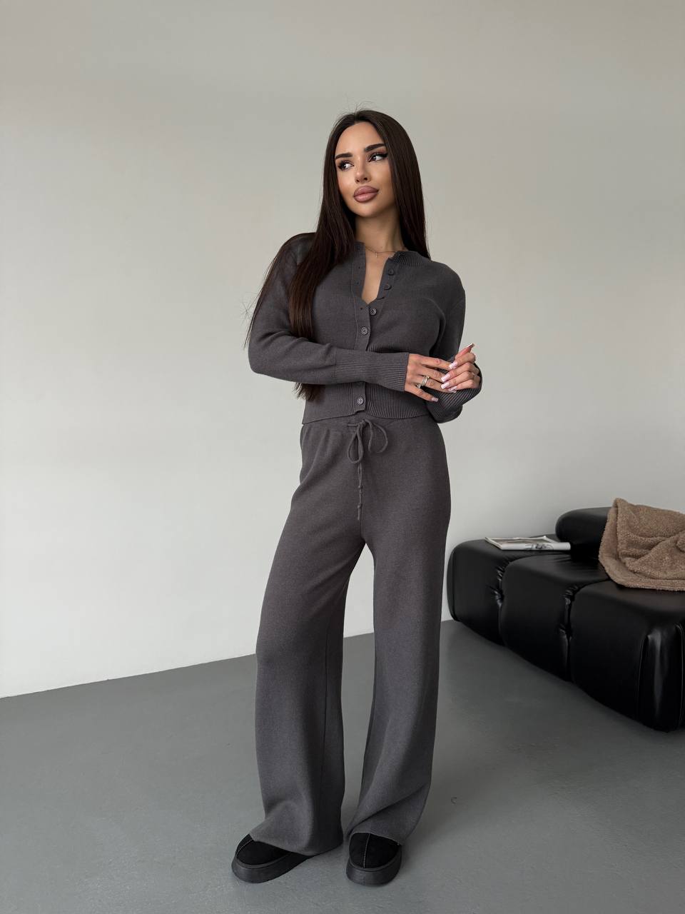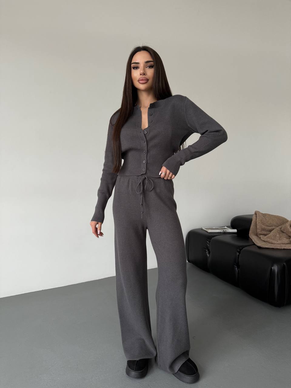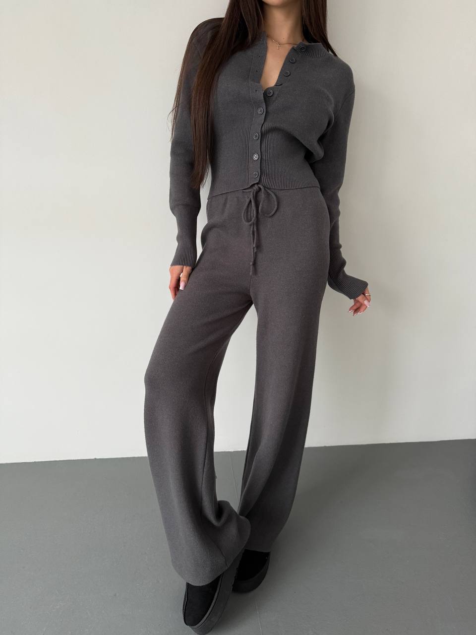 Женский Трикотажный Графитовый Костюм Комплект Двойка – Приталенный Кардиган + Свободные Прямые Штаны