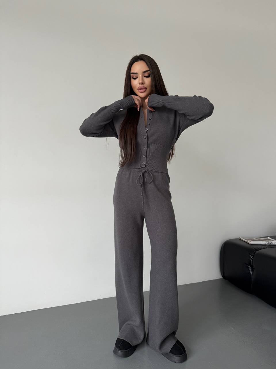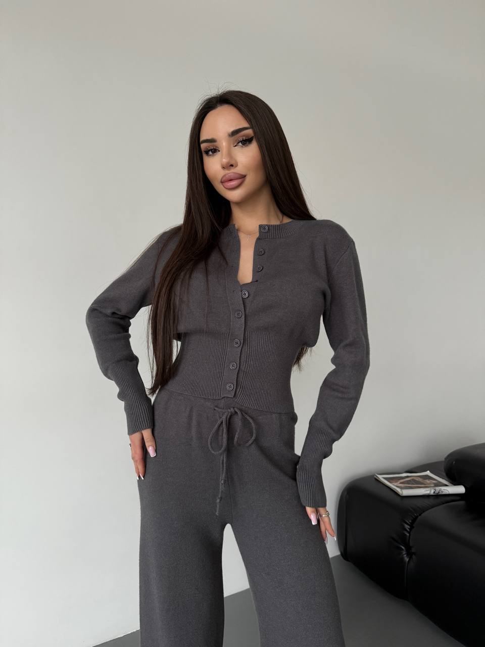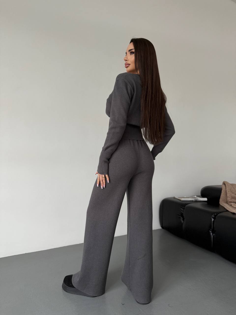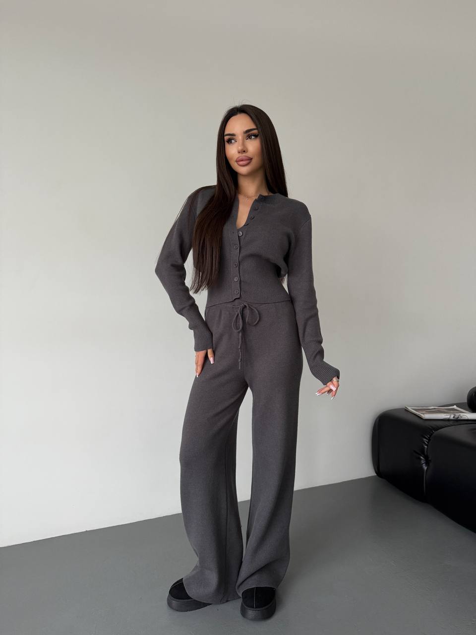 Женский Трикотажный Графитовый Костюм Комплект Двойка – Приталенный Кардиган + Свободные Прямые Штаны
