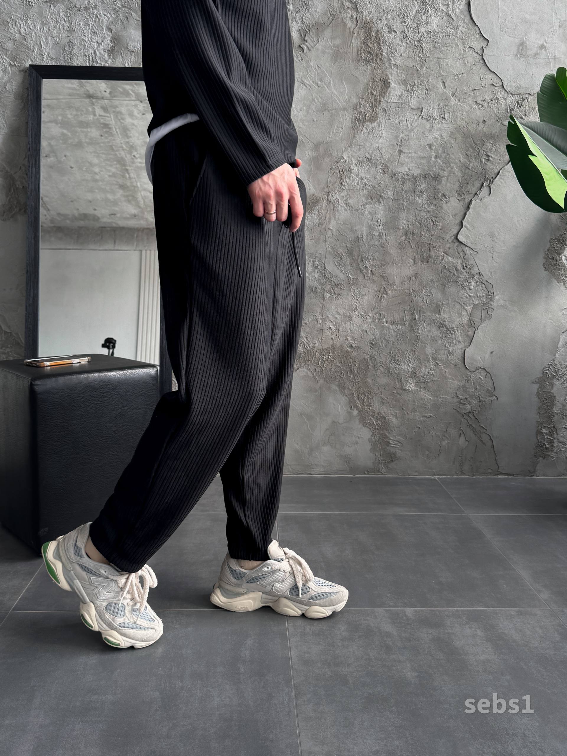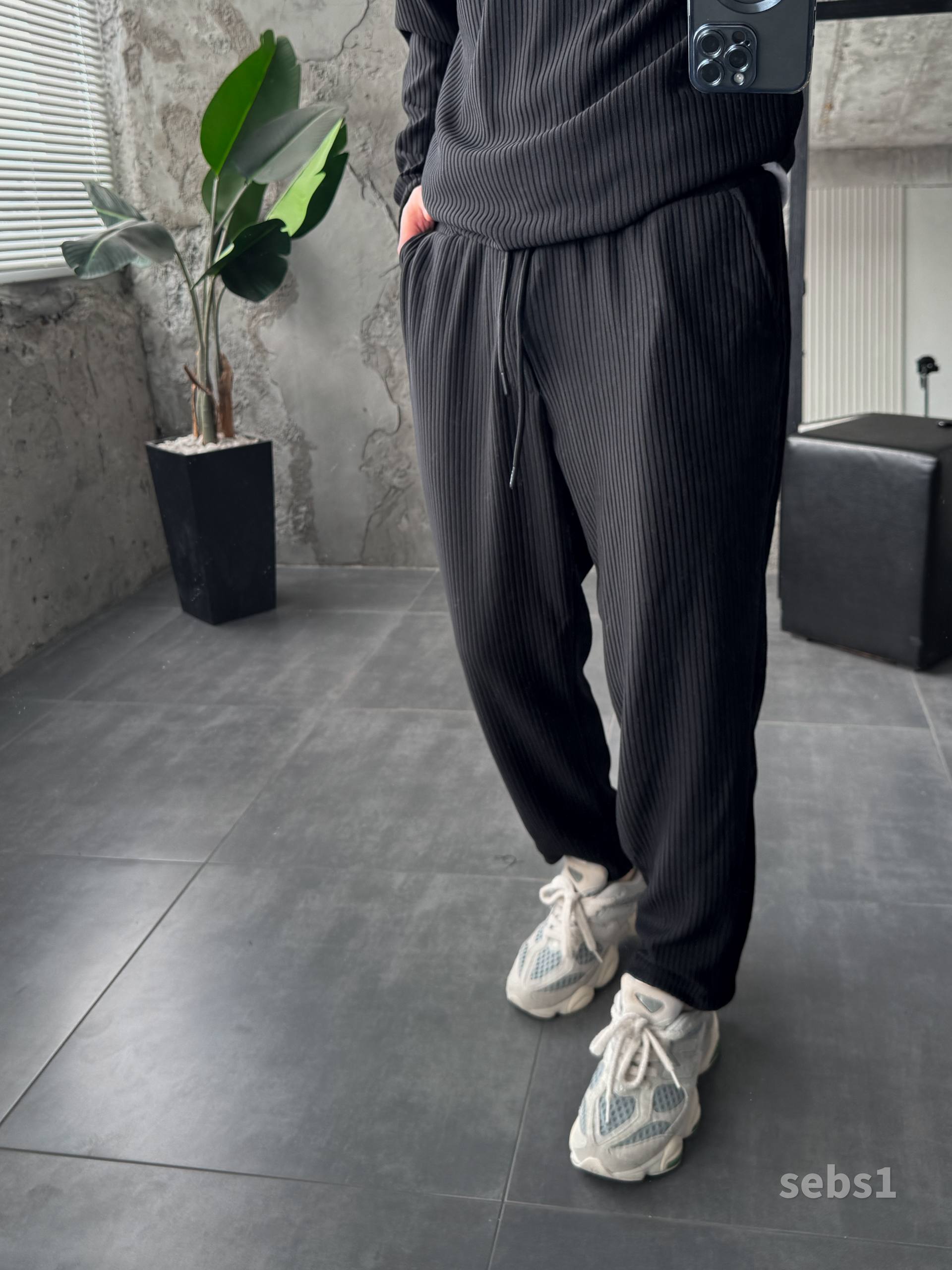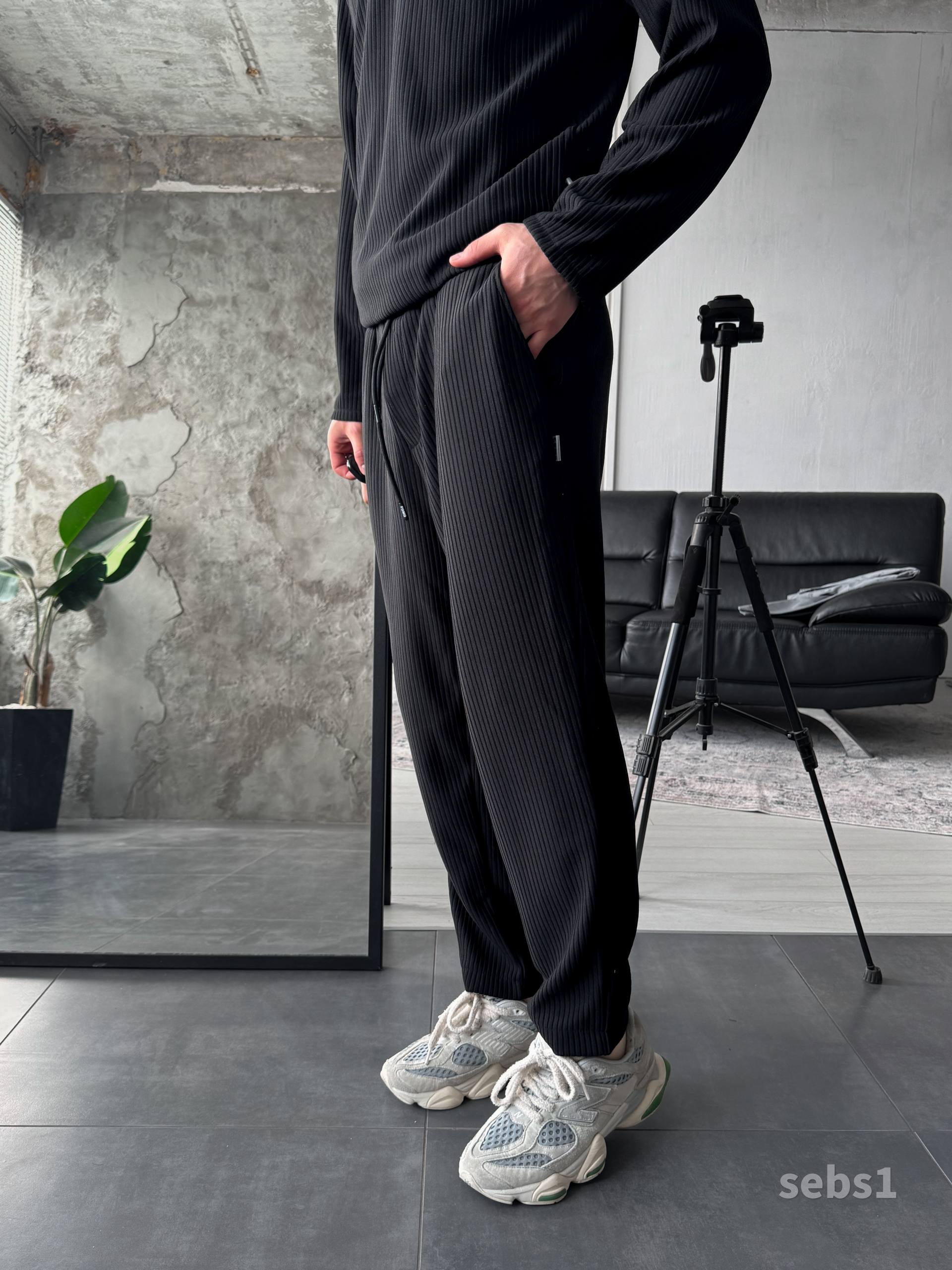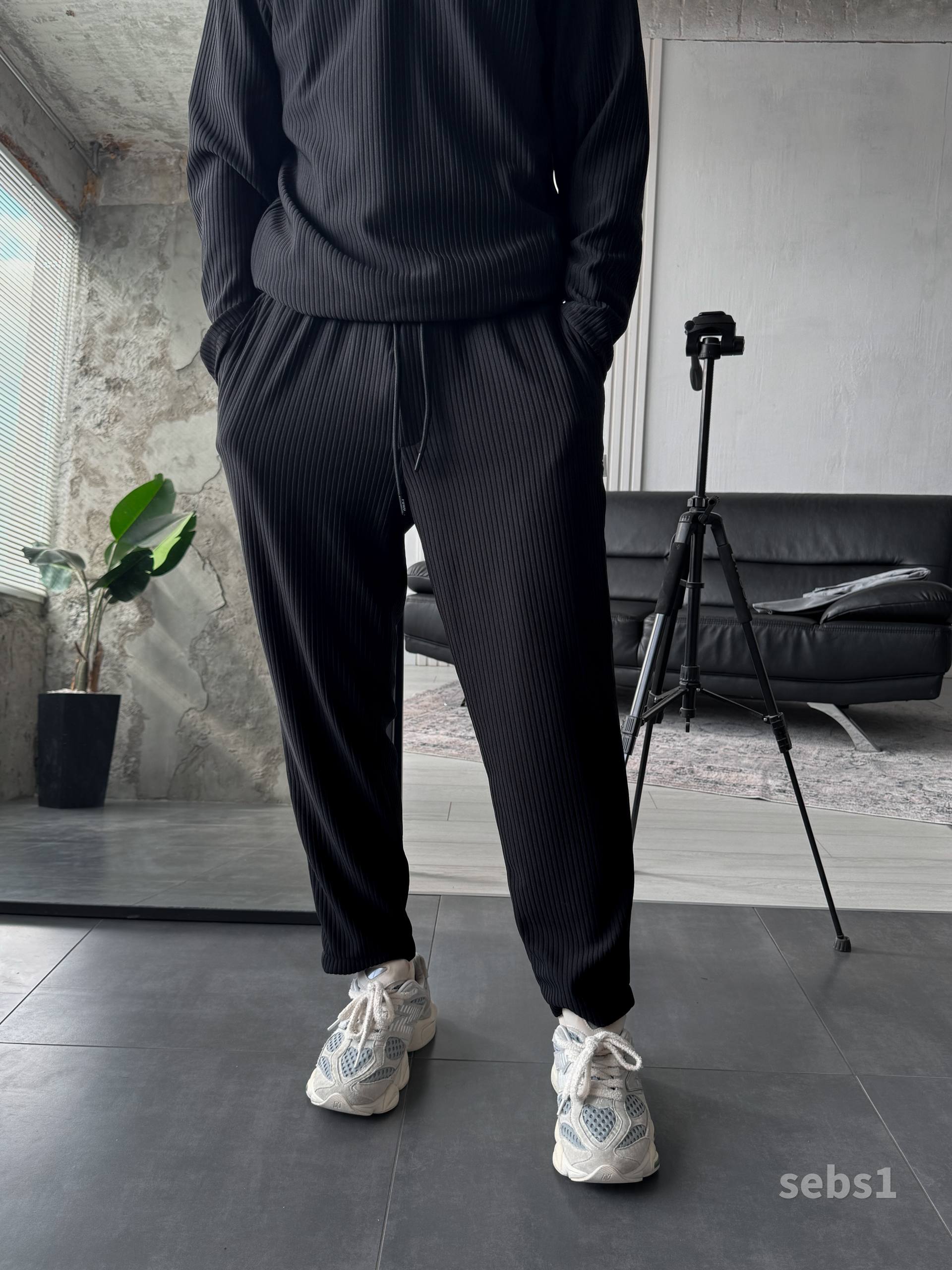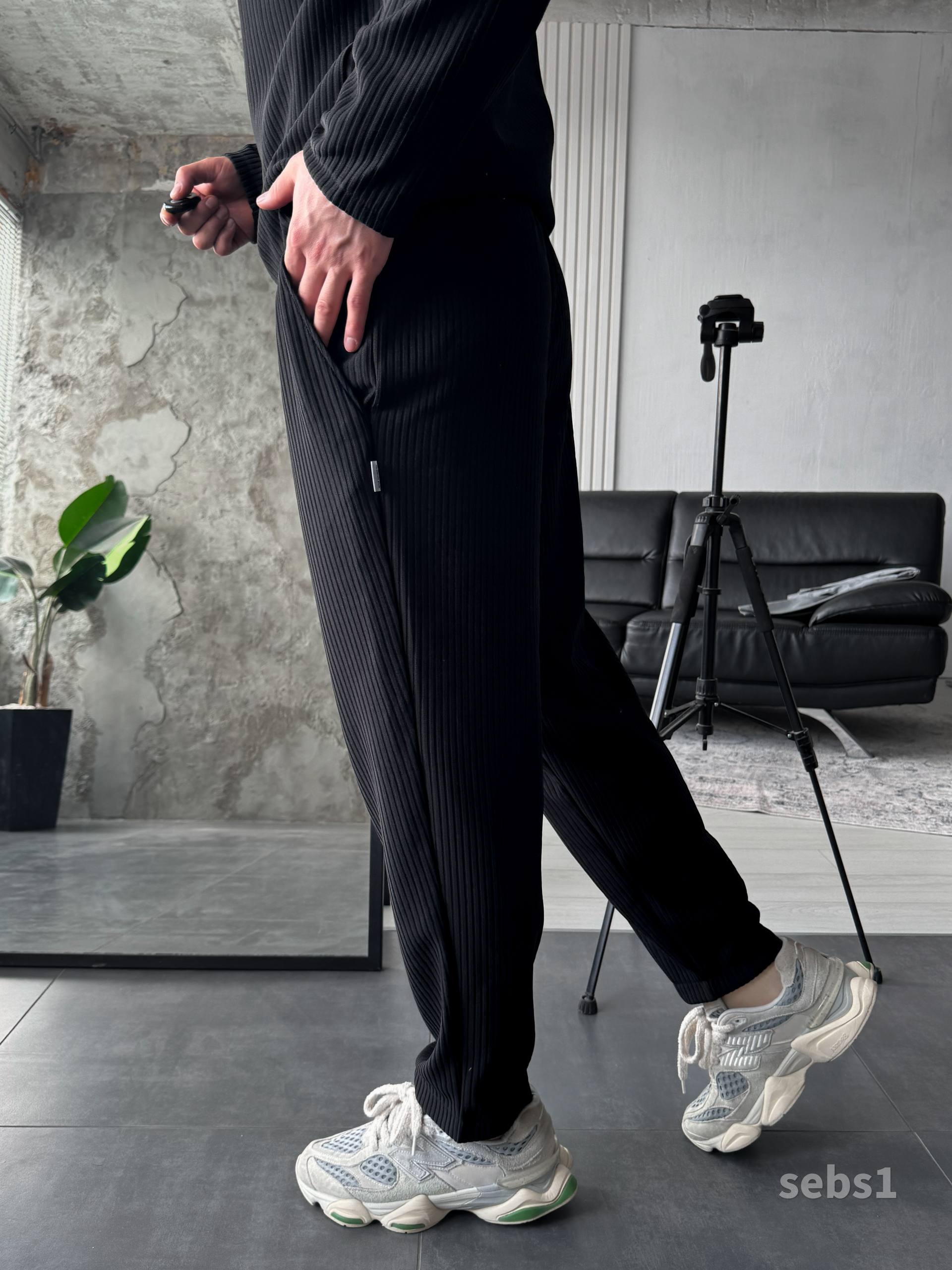 Мужские Свободные Базовые Черные Штаны на Резинке в Рубчик