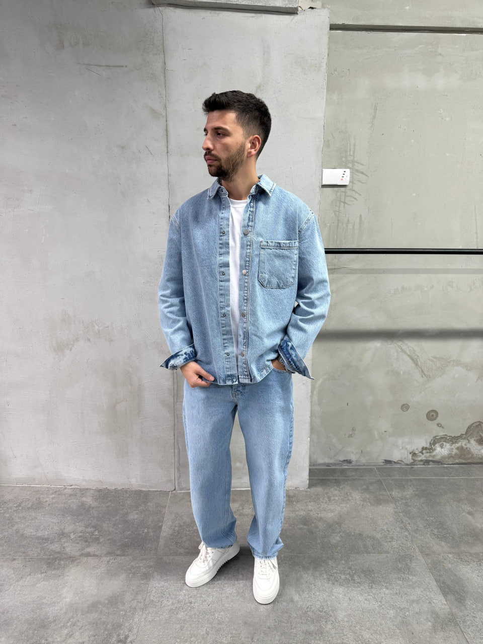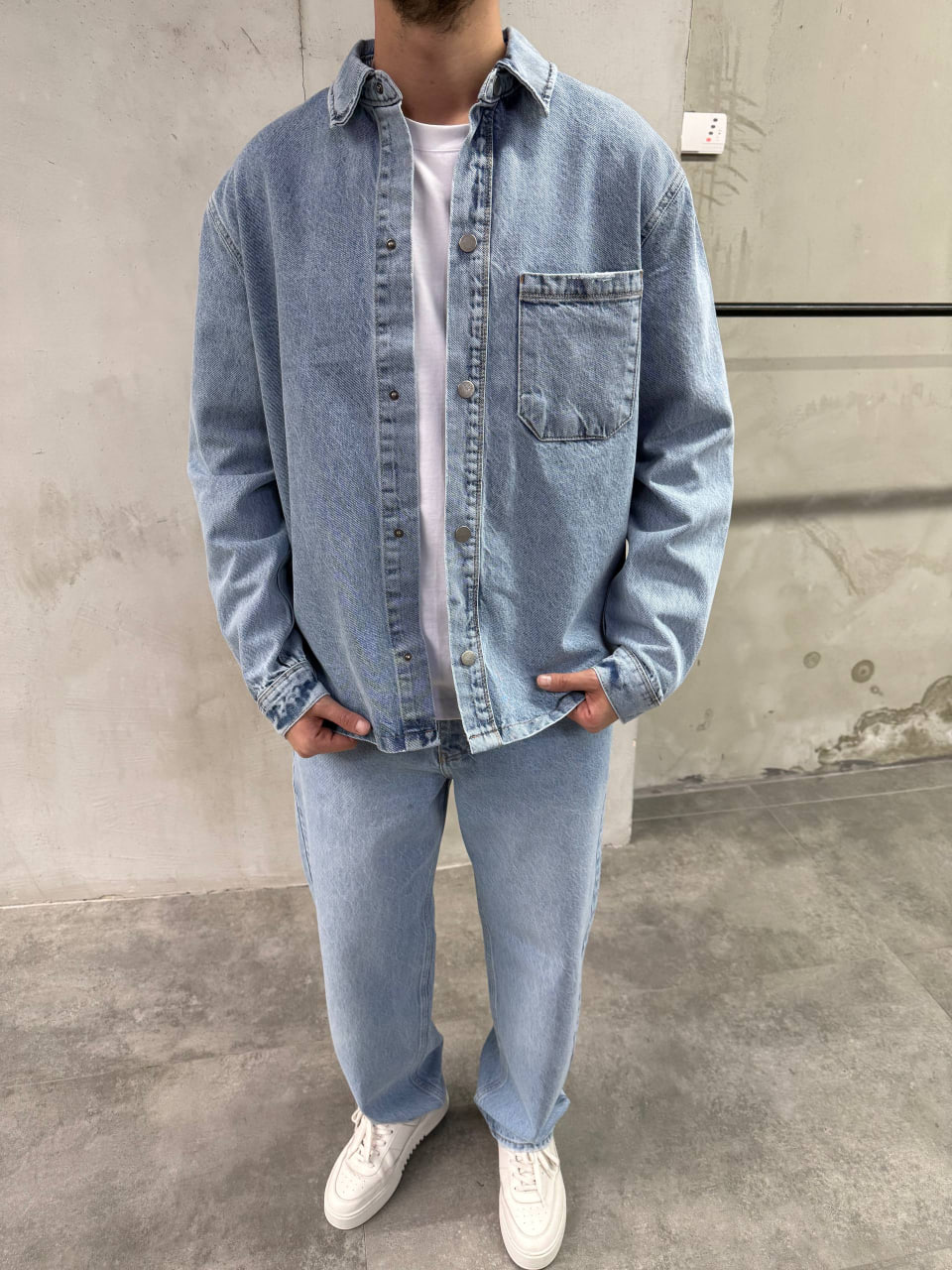 Мужская Базовая Голубая Джинсовка Свободного Кроя – Джинсовая Рубашка Оверсайз на Кнопках
