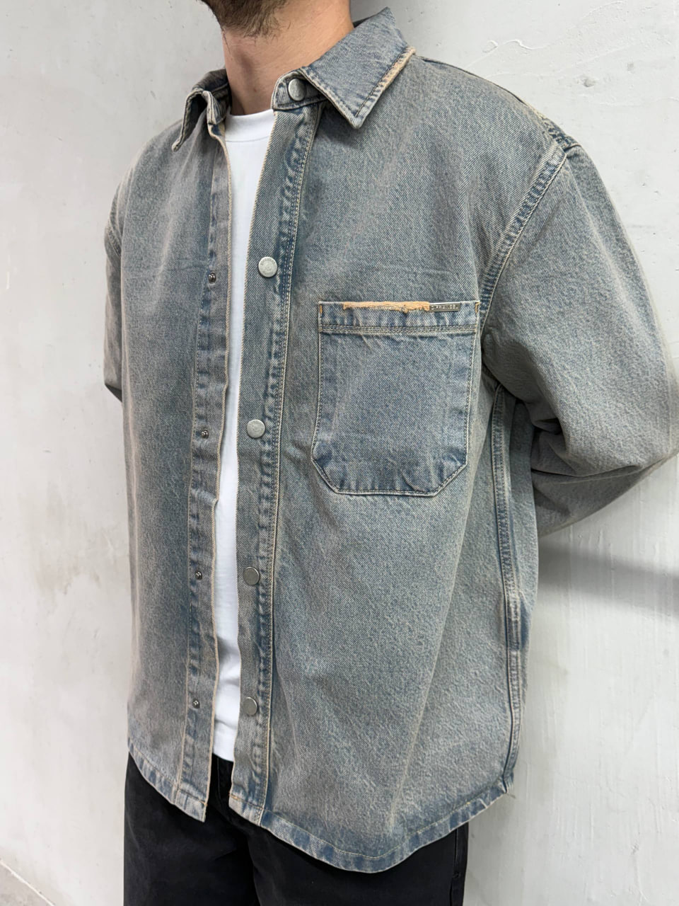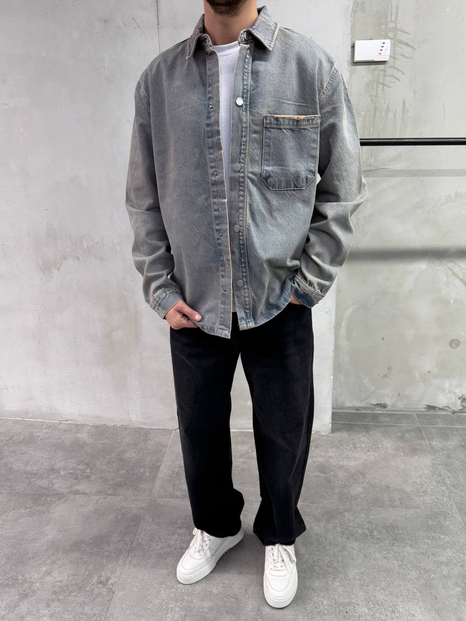 Мужская Голубая Джинсовка с Грязным Эффектом – Джинсовая Рубашка Оверсайз
