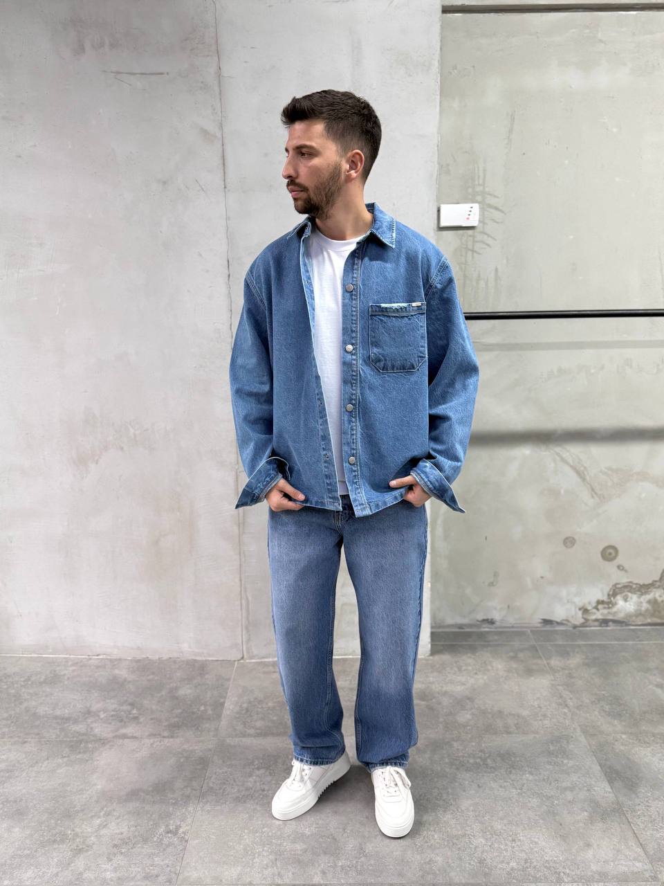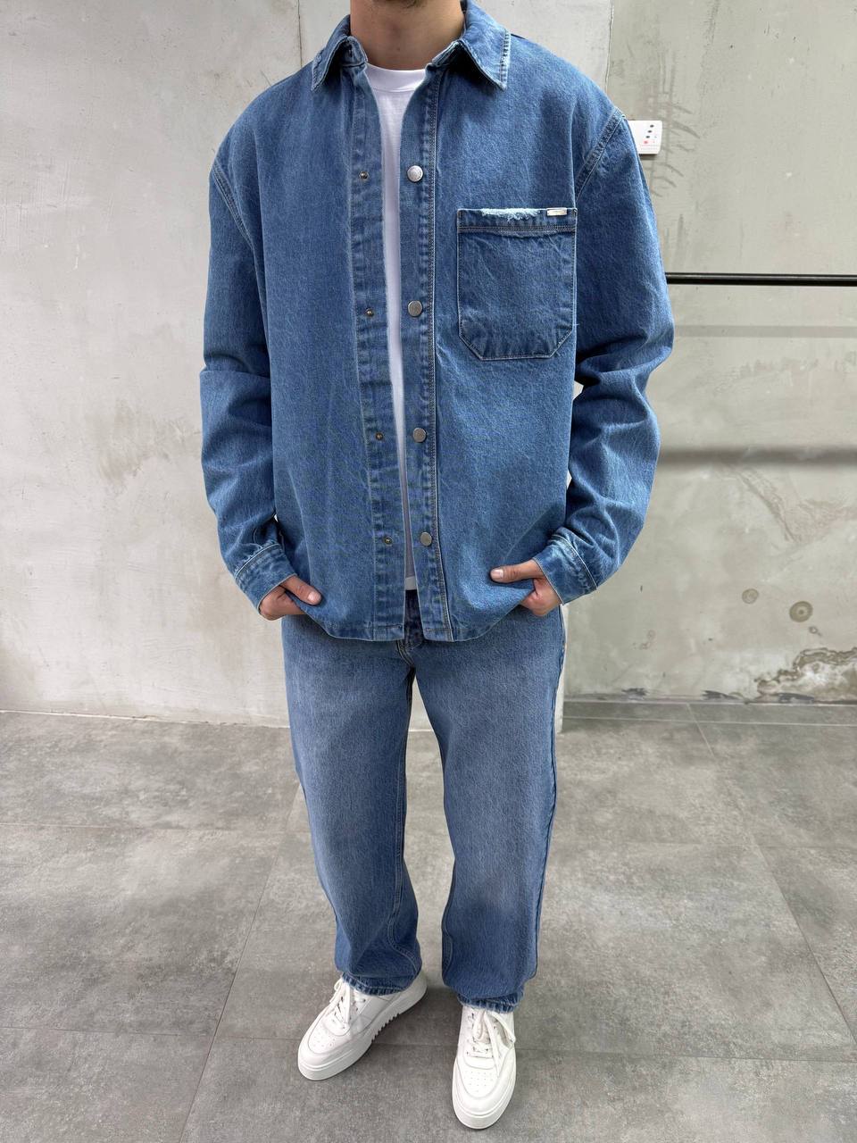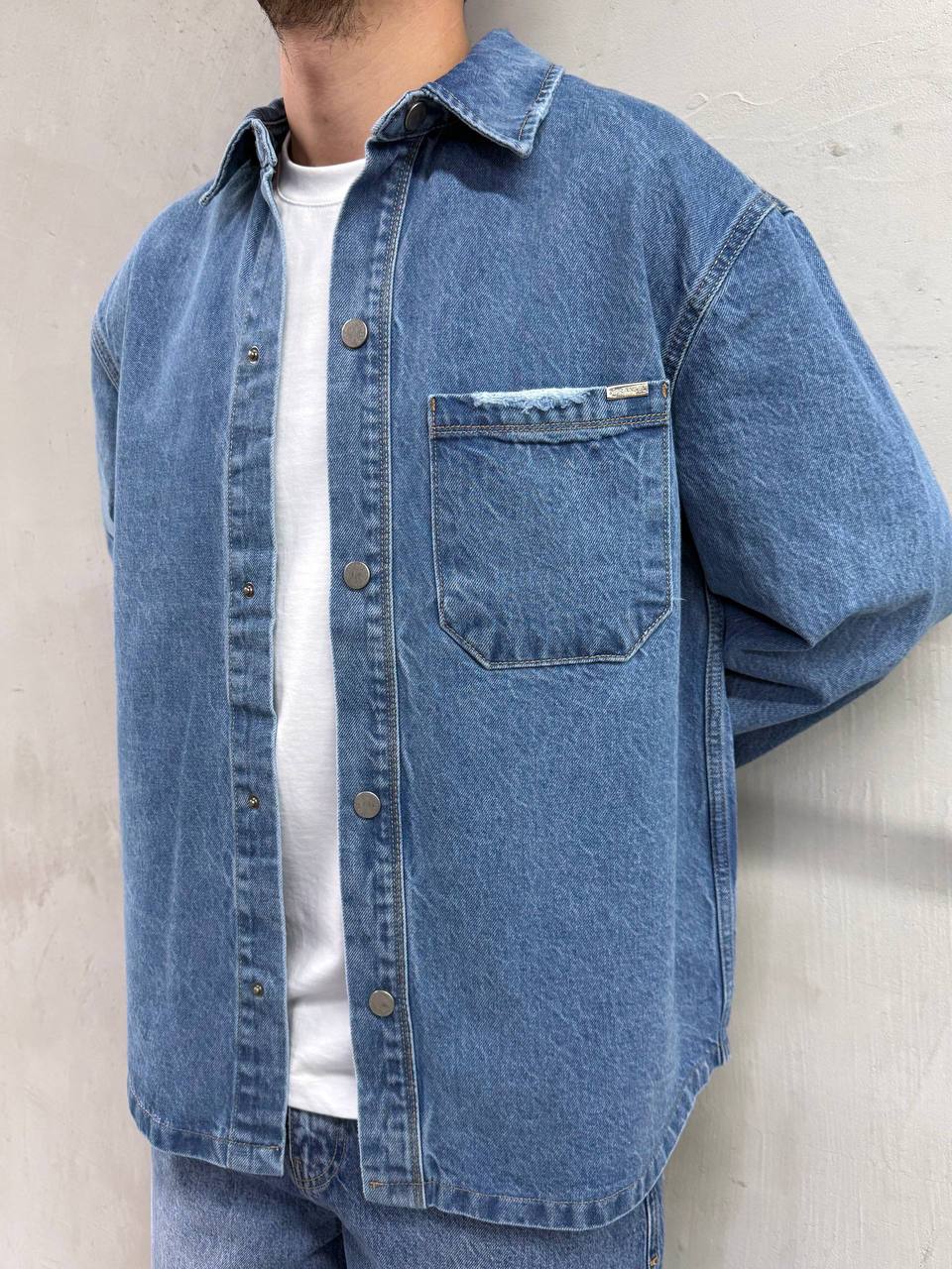 Мужская Синяя Джинсовка Свободного Кроя на Кнопках с Потертостями