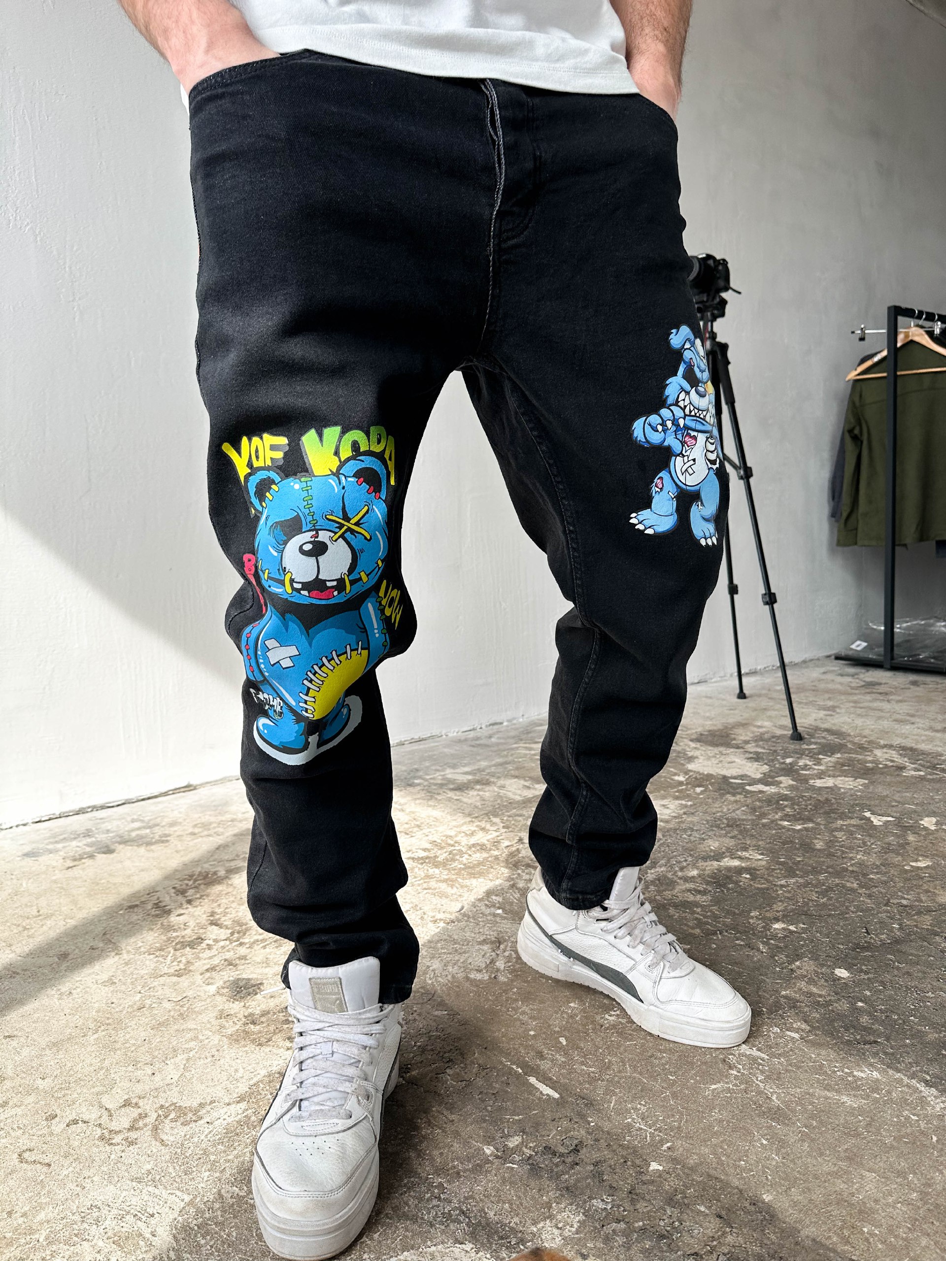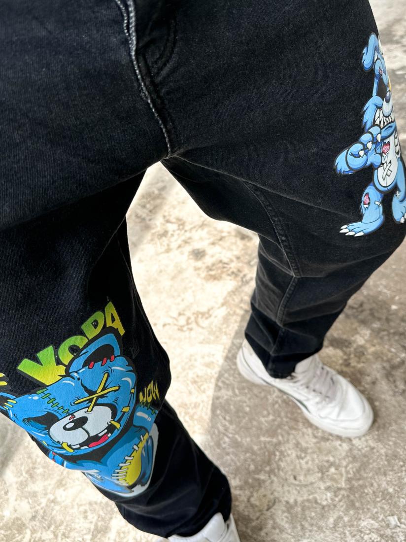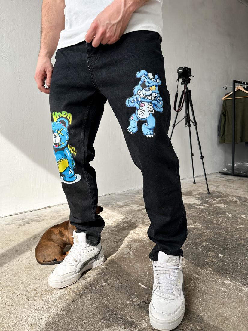 Мужские Черные Джинсы Прямого Кроя с Яркими Принтами