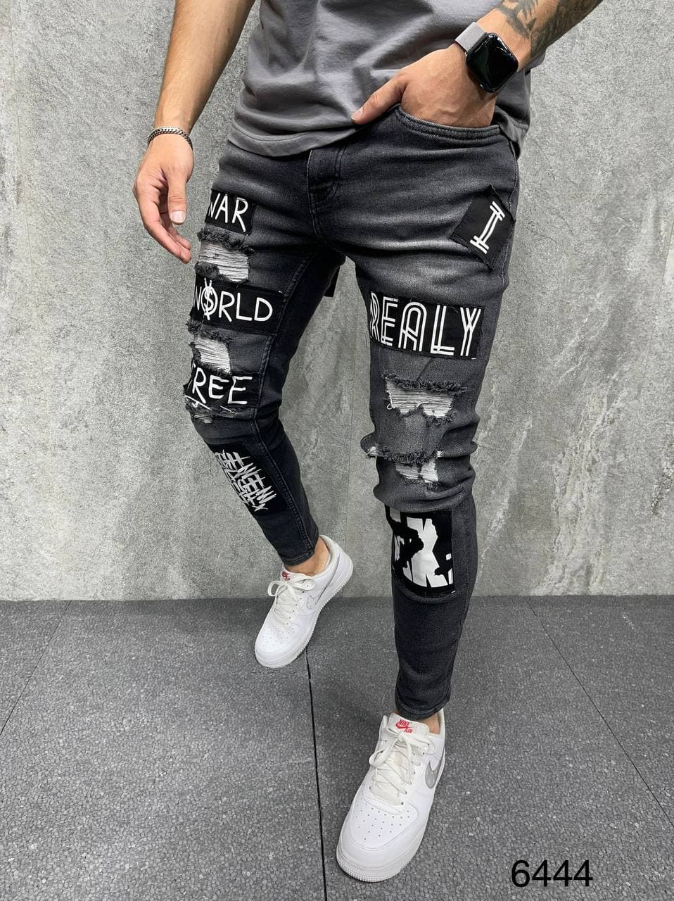 Мужские Джинсы Зауженные Рваные – Серые с Нашивками Узкие