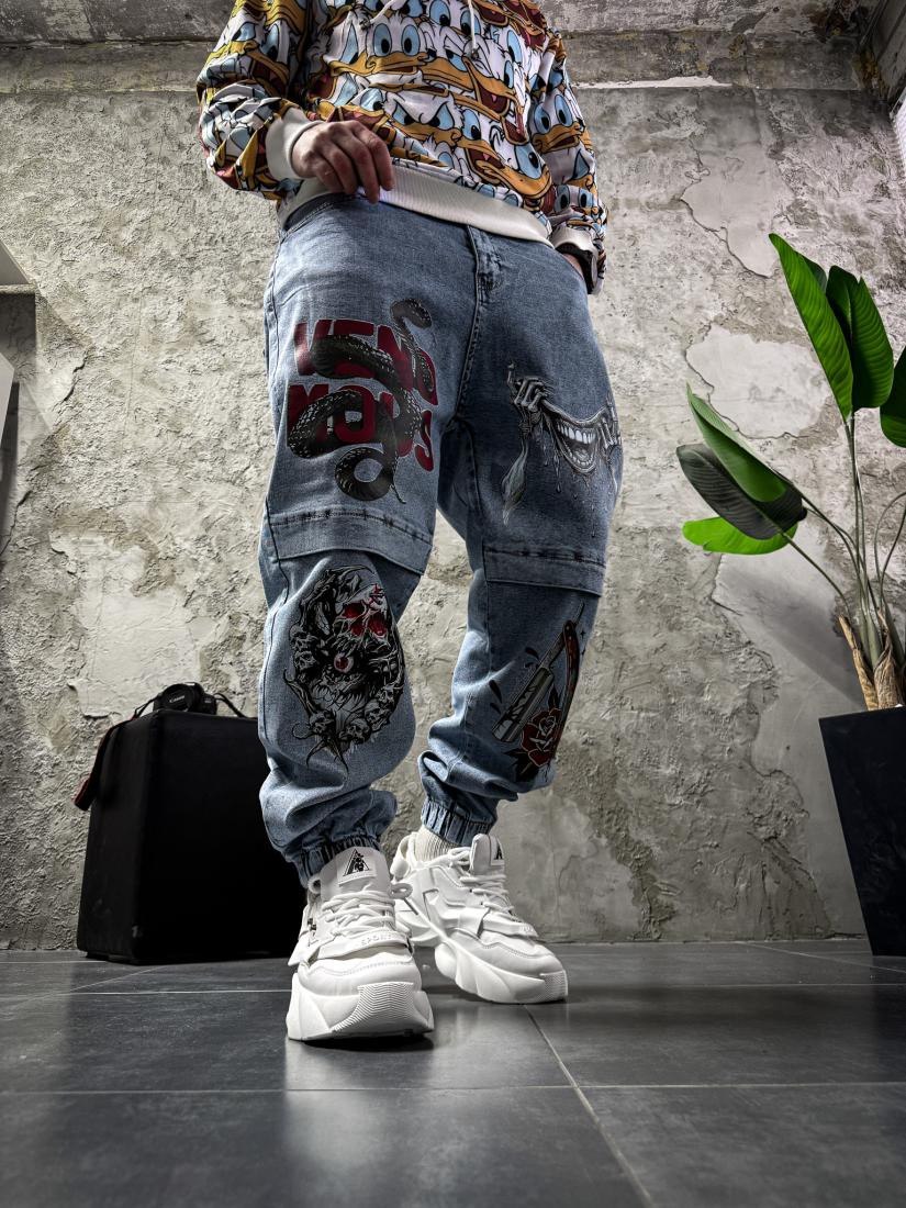 Мужские Голубые Джинсы Джоггеры с Принтами – Джинсовые Штаны с Манжетами
