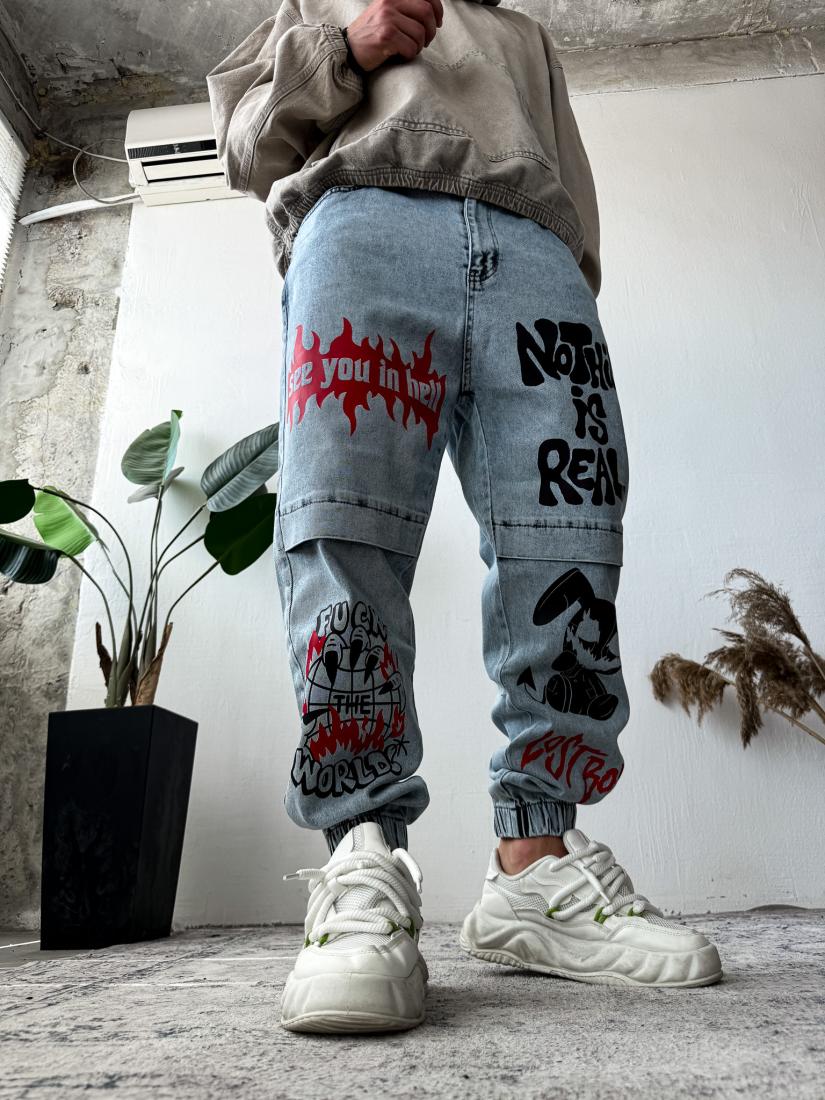 Мужские Голубые Джинсы Джоггеры Свободного Кроя с Принтами