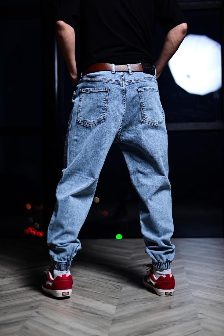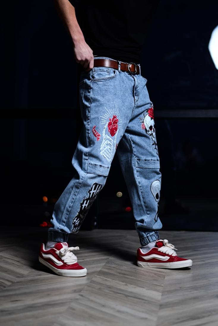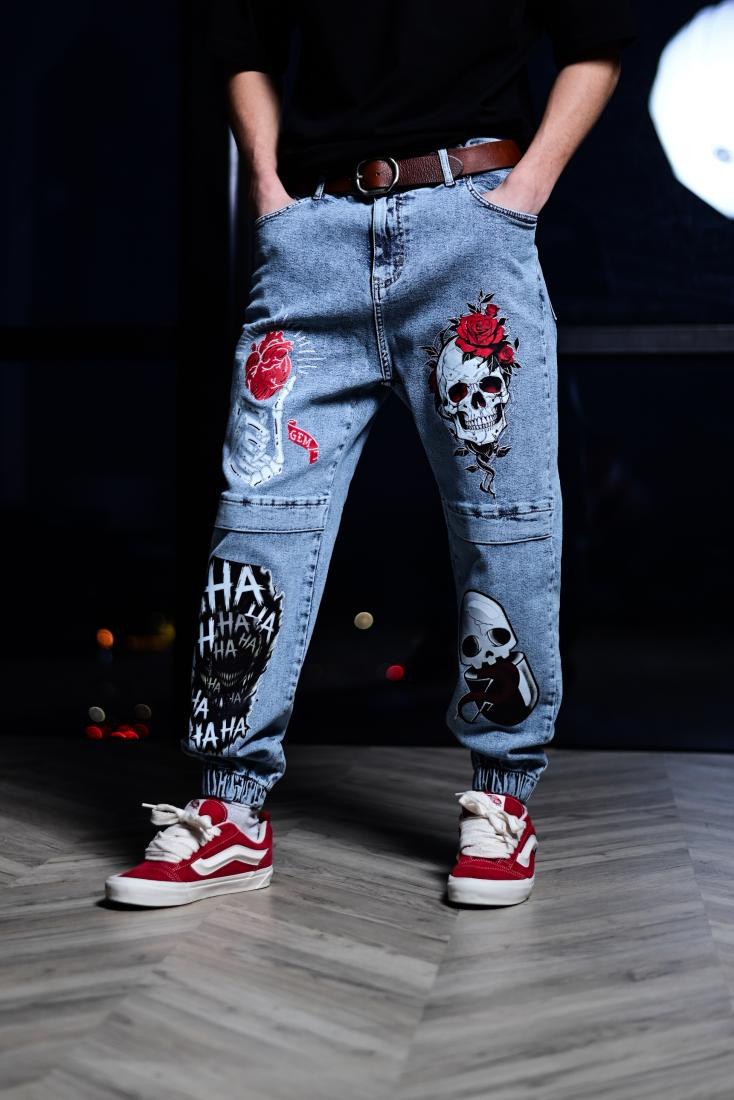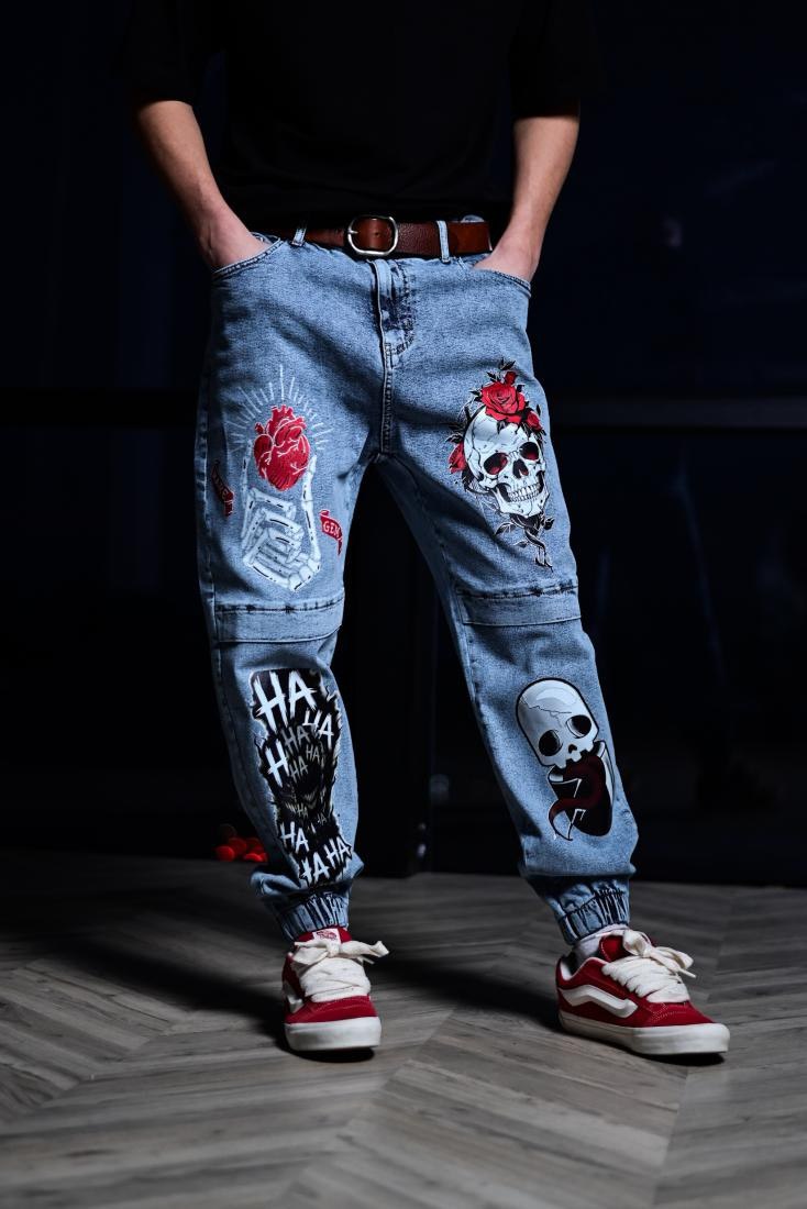 Мужские Голубые Джинсы Джоггеры Свободного Кроя в Принтах