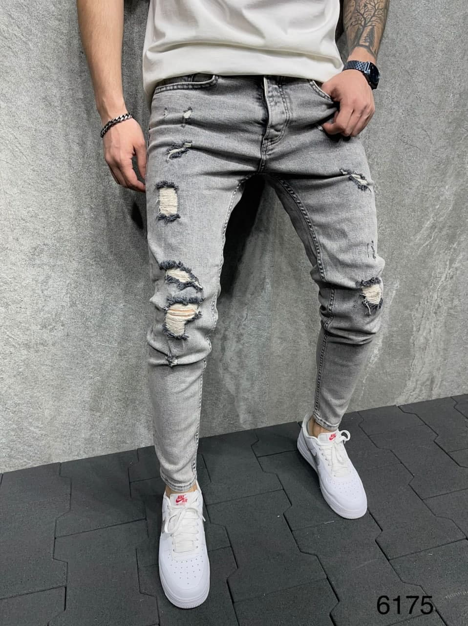 Мужские Серые Джинсы Узкие – Зауженные Рваные с Дырками и Потертостями