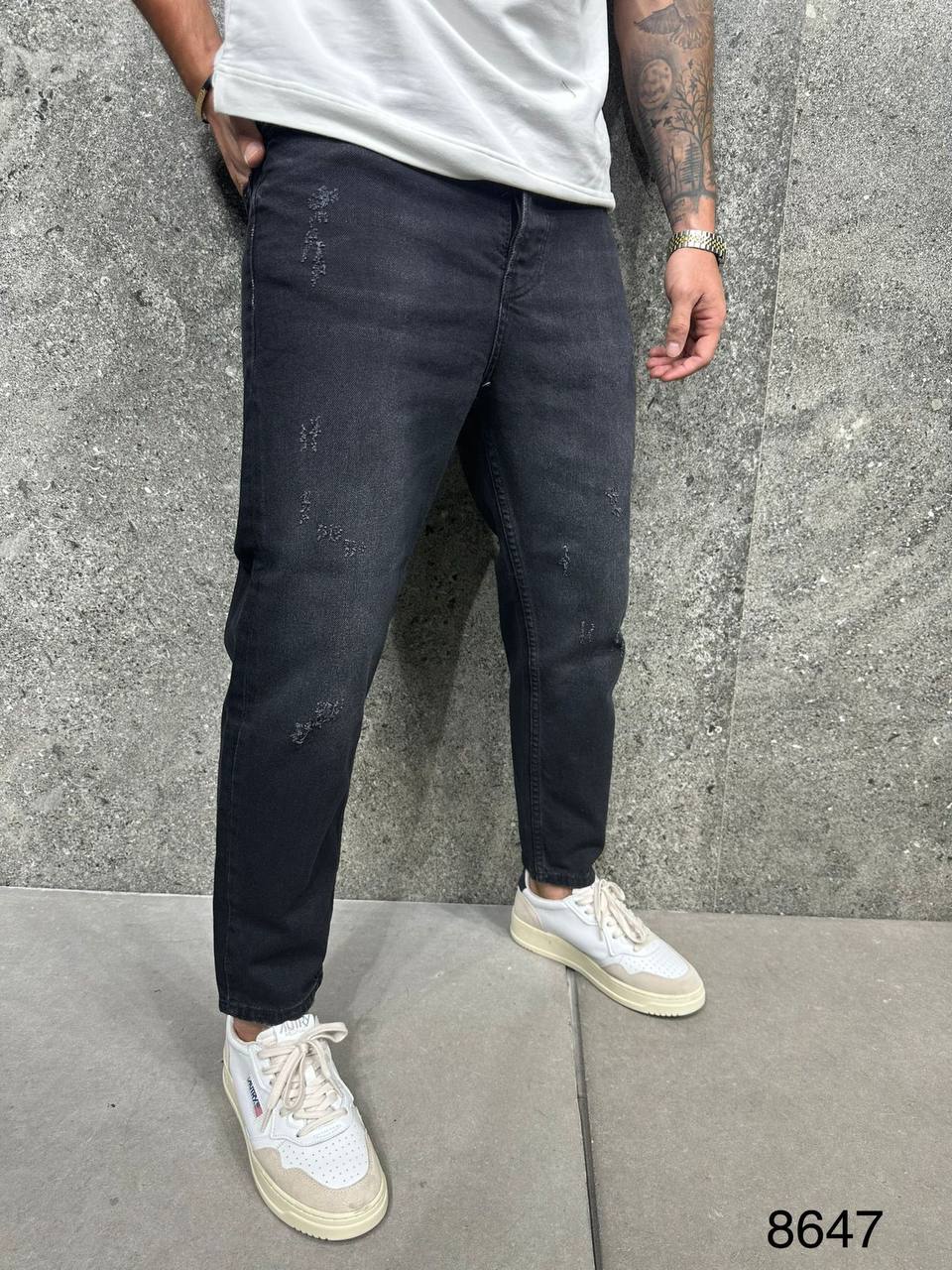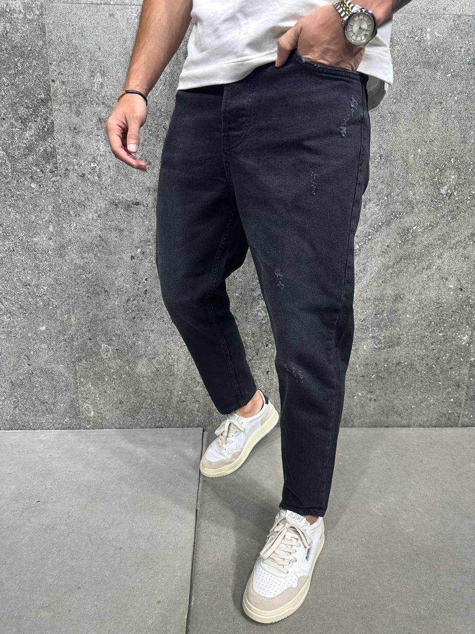 Мужские Свободные Черные Джинсы Момы с Потертостями