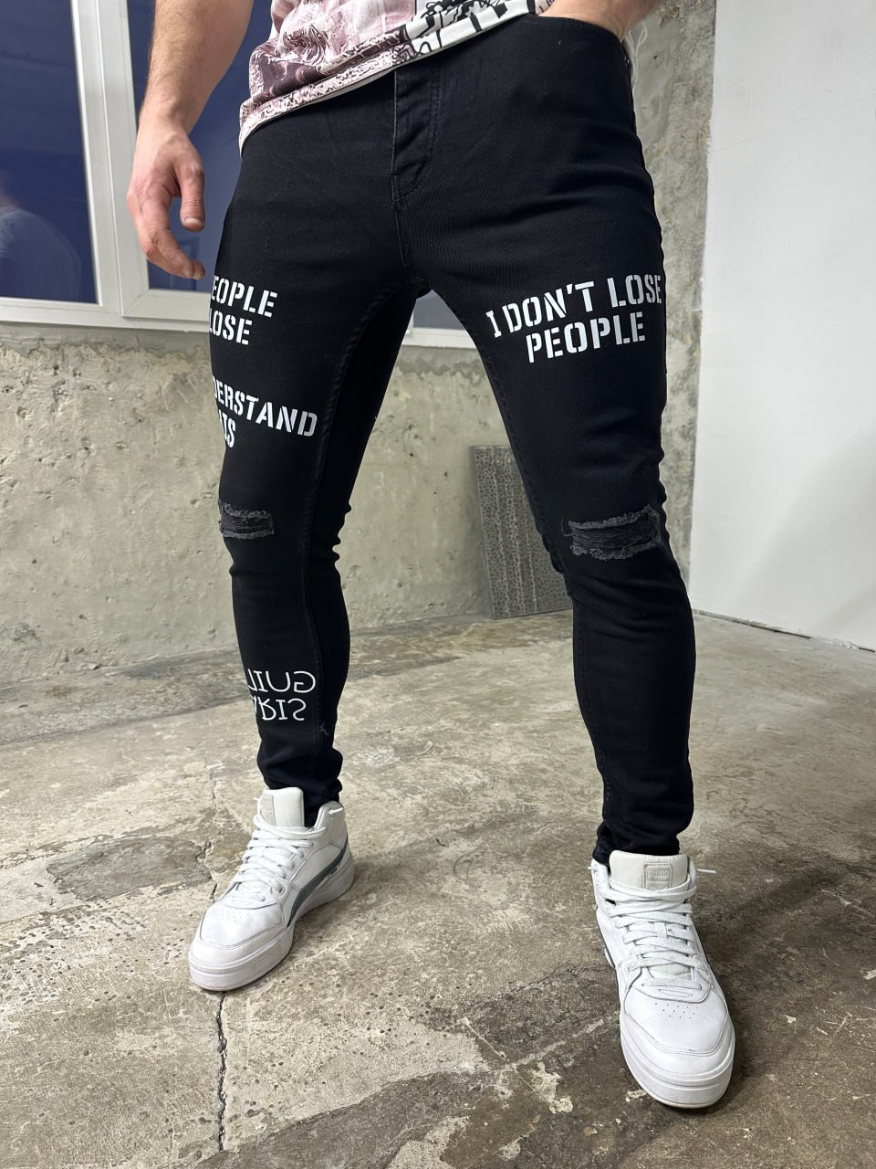 Мужские Узкие Черные Джинсы с Надписями и Рваными Коленями