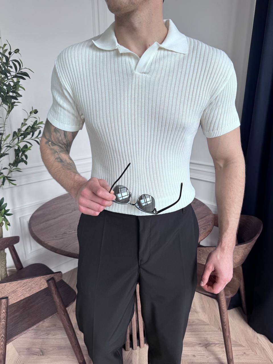 Мужская Базовая Белая Футболка Поло Приталенного Кроя в Широкий Рубчик