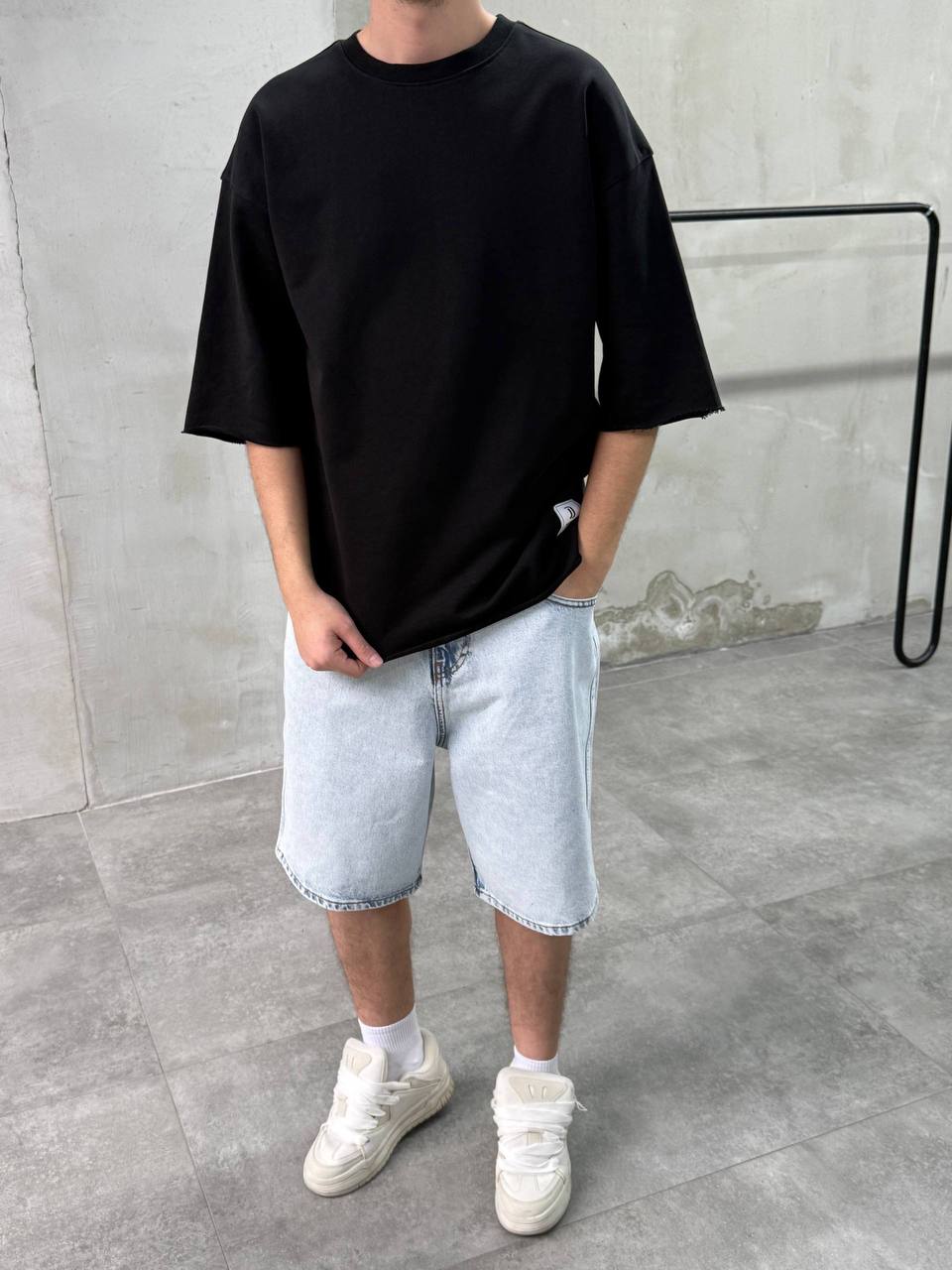 Мужская Базовая Черная Футболка Хлопок – Объемная Оверсайз с Необработанными Краями