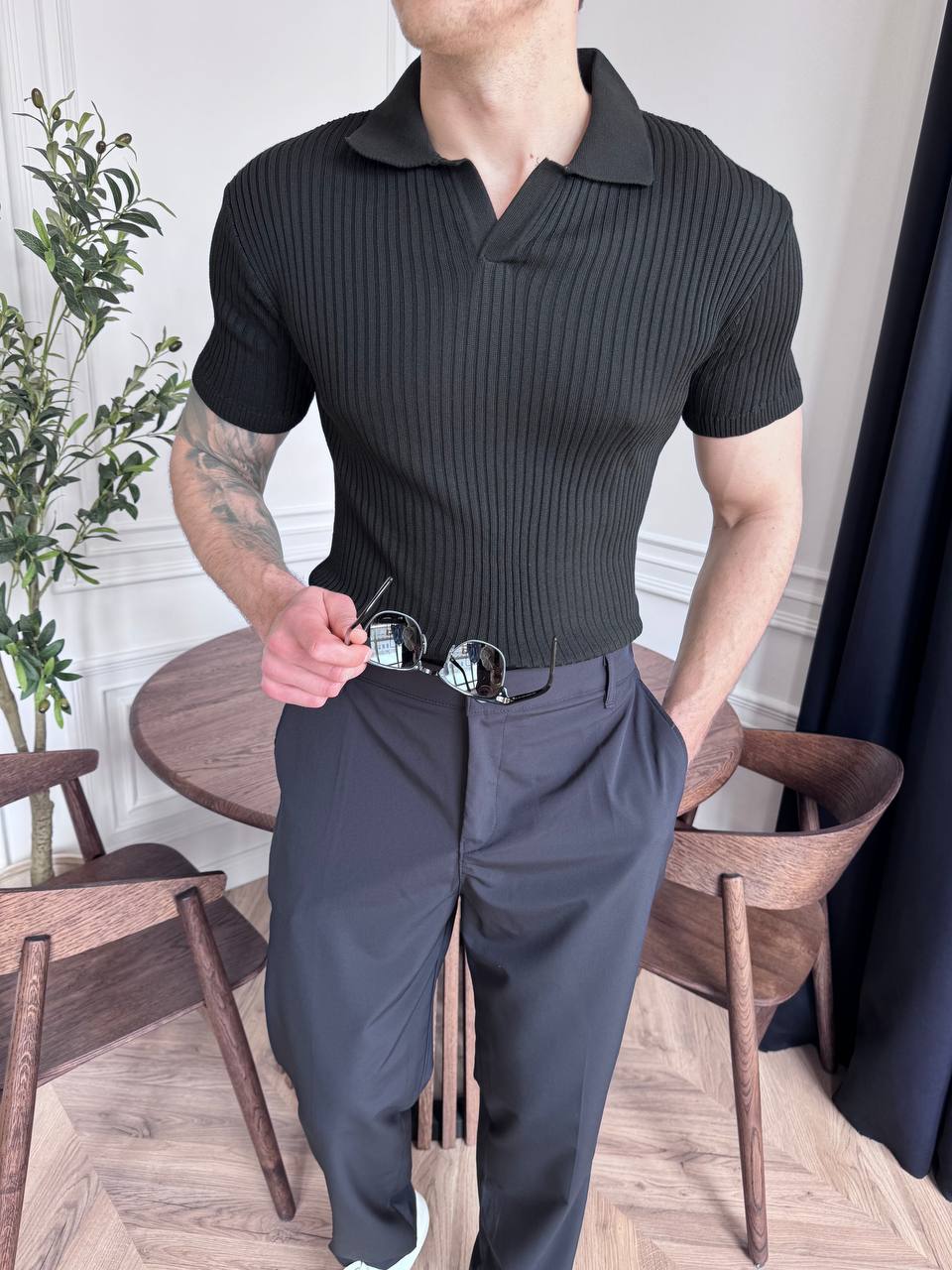 Мужская Базовая Черная Футболка Поло Приталенного Кроя в Широкий Рубчик