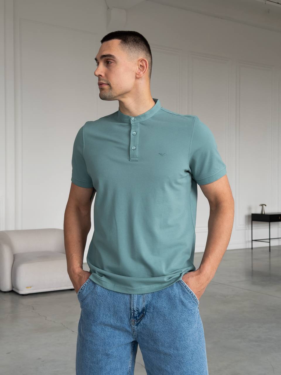 Мужская Базовая Хлопковая Бирюзовая Футболка с Пуговицами
