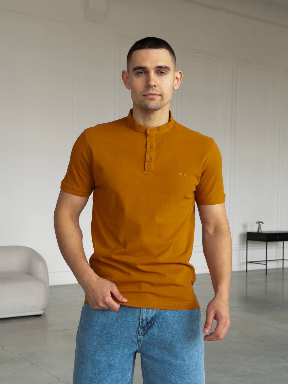 Мужская Базовая Хлопковая Оранжевая Футболка с Пуговицами