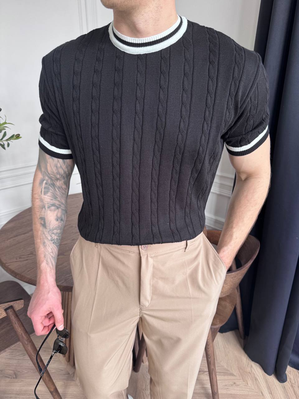 Мужская Базовая Классическая Черная Футболка Косичка с Окантовкой
