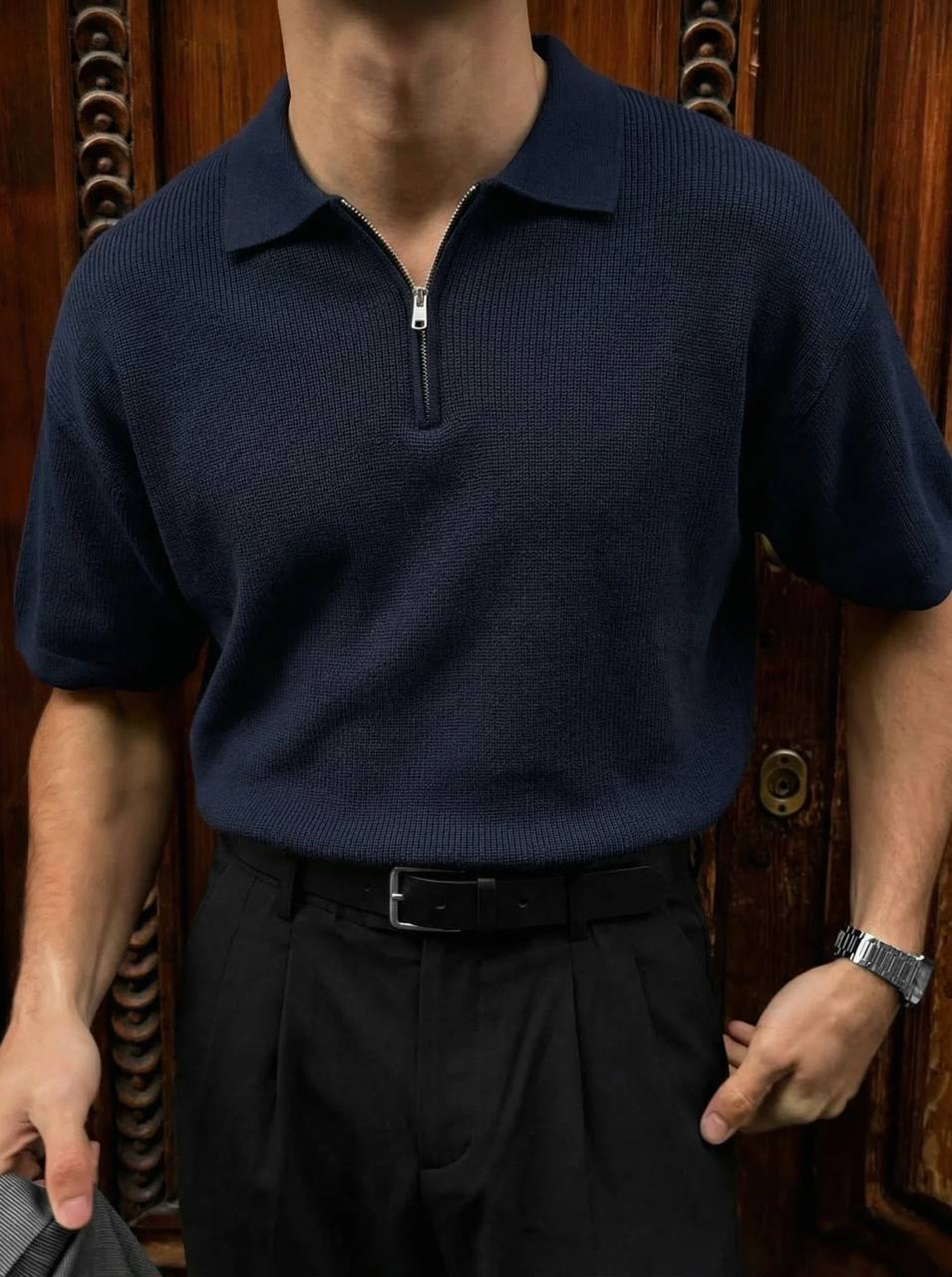 Мужская Базовая Темно-Синяя Футболка Поло Свободного Кроя с Воротником на Змейке