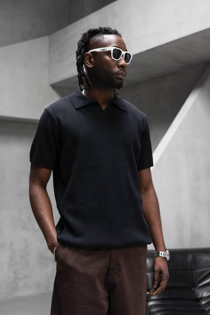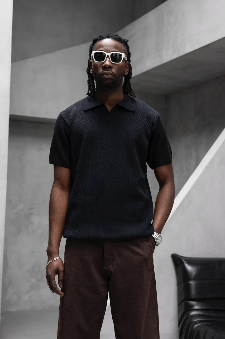 Мужская Базовая Трикотажная Черная Футболка Свободного Кроя с Воротником Поло