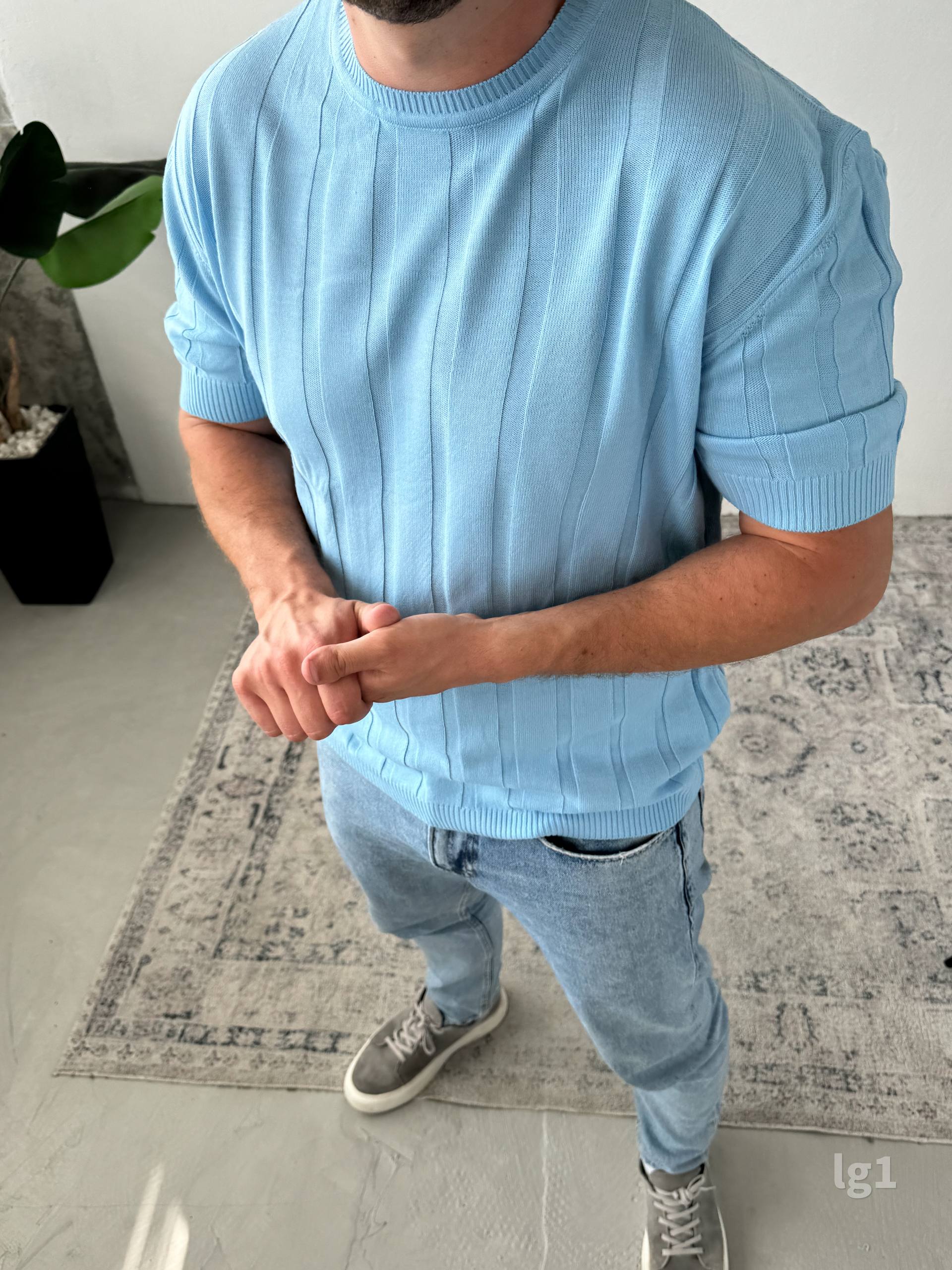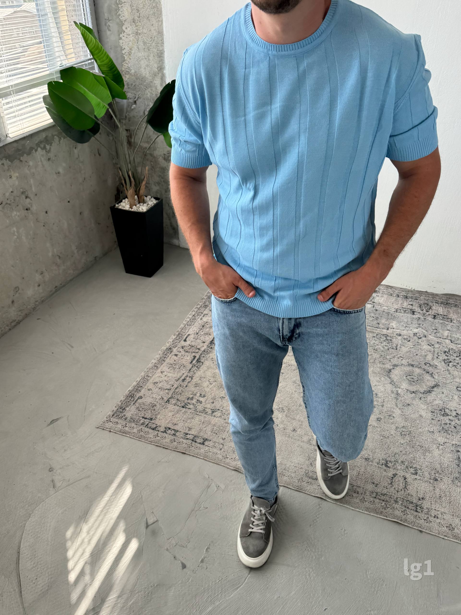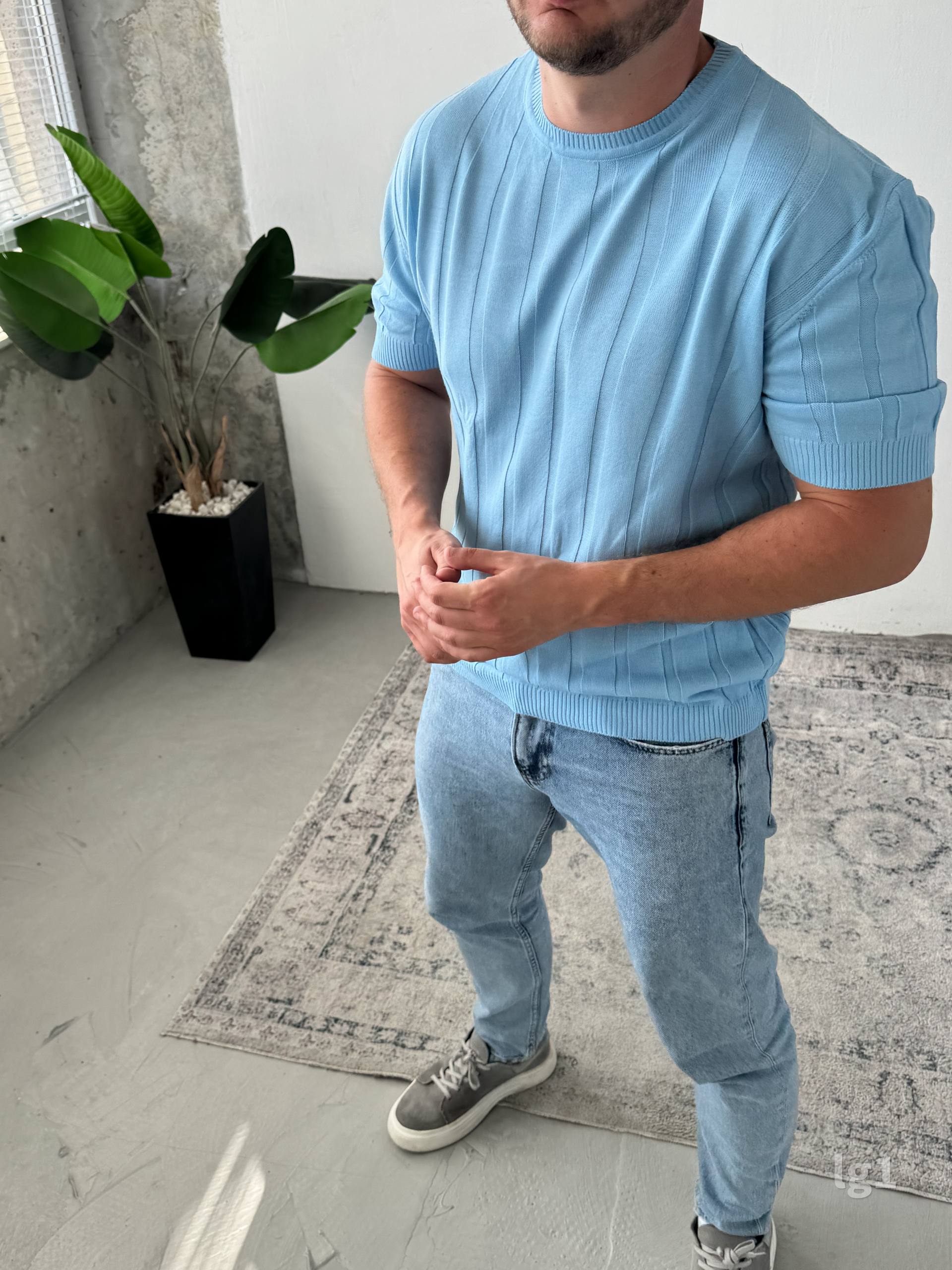 Мужская Базовая Трикотажная Голубая Футболка с Круглым Вырезом Горловины