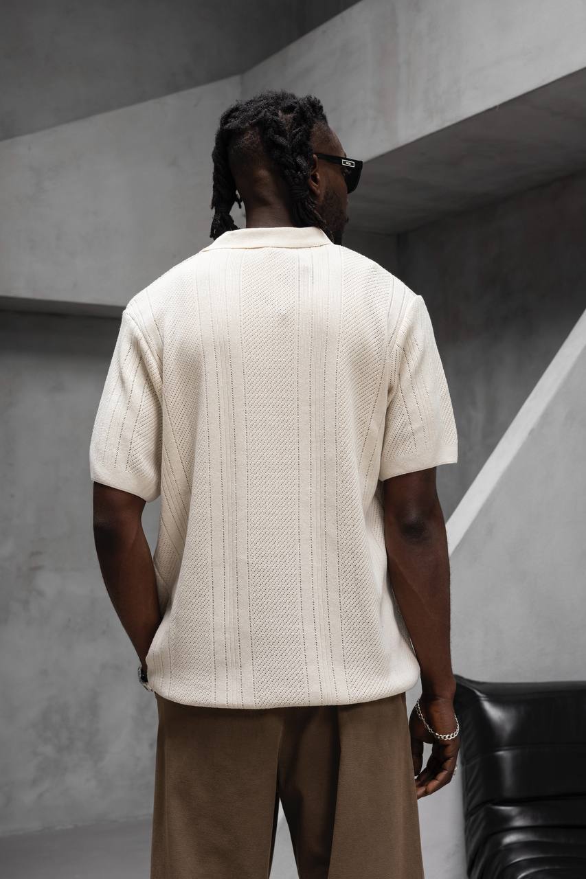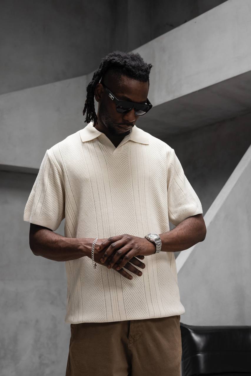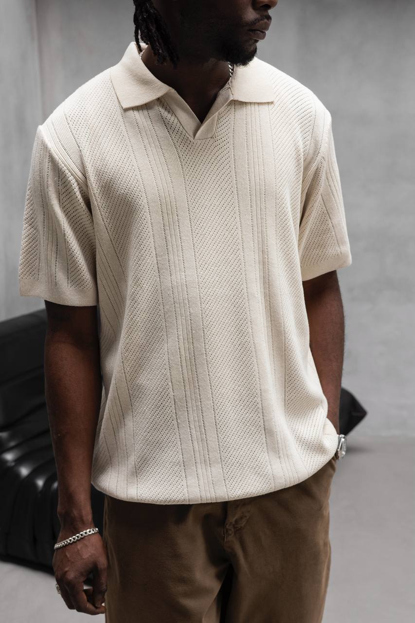 Мужская Базовая Трикотажная Молочная Футболка Свободного Кроя с Воротником Поло