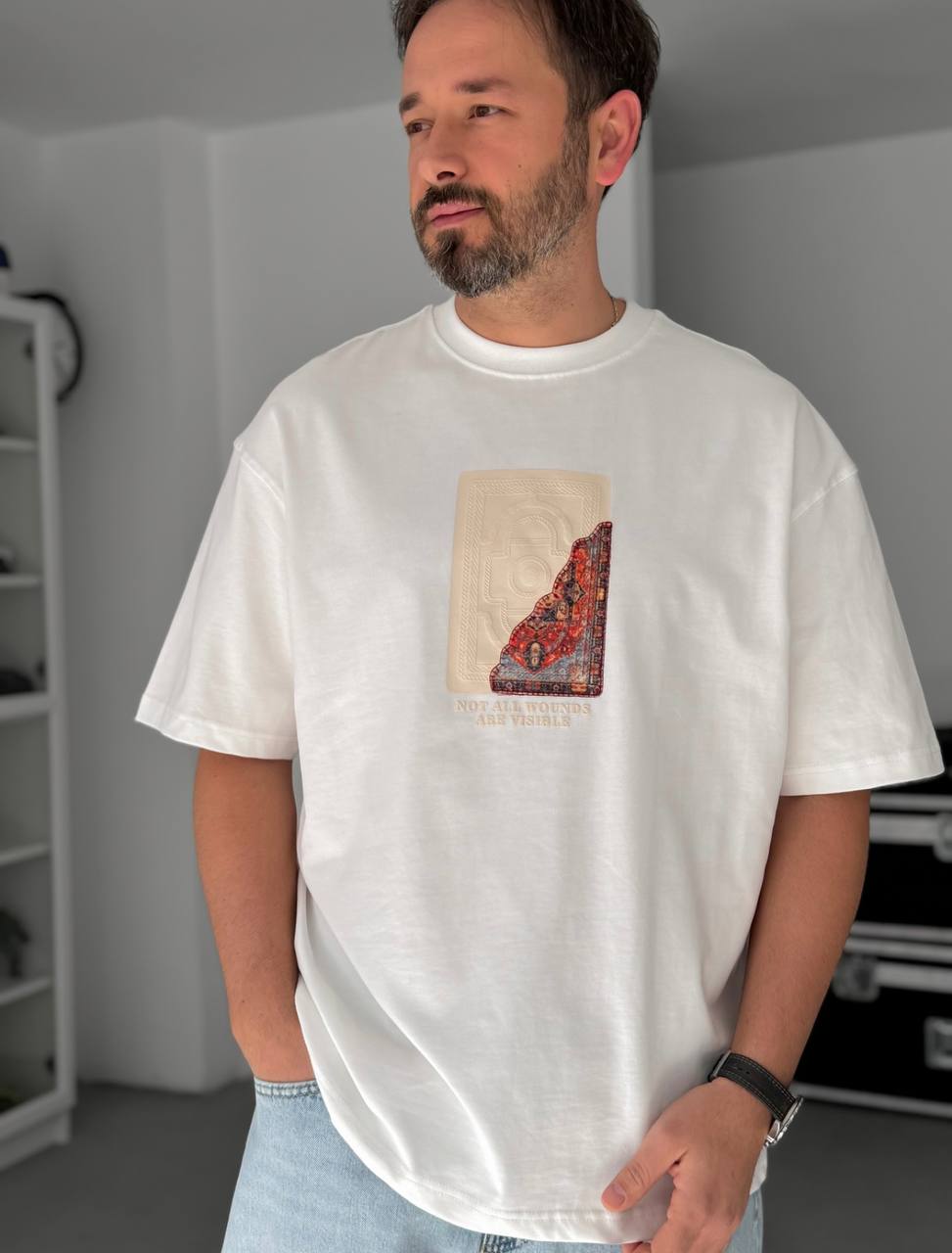 Мужская Белая Футболка «NOT ALL WOUNDS ARE VISIBLE» – Хлопковая Оверсайз с Бархатным Принтом и Вышивкой