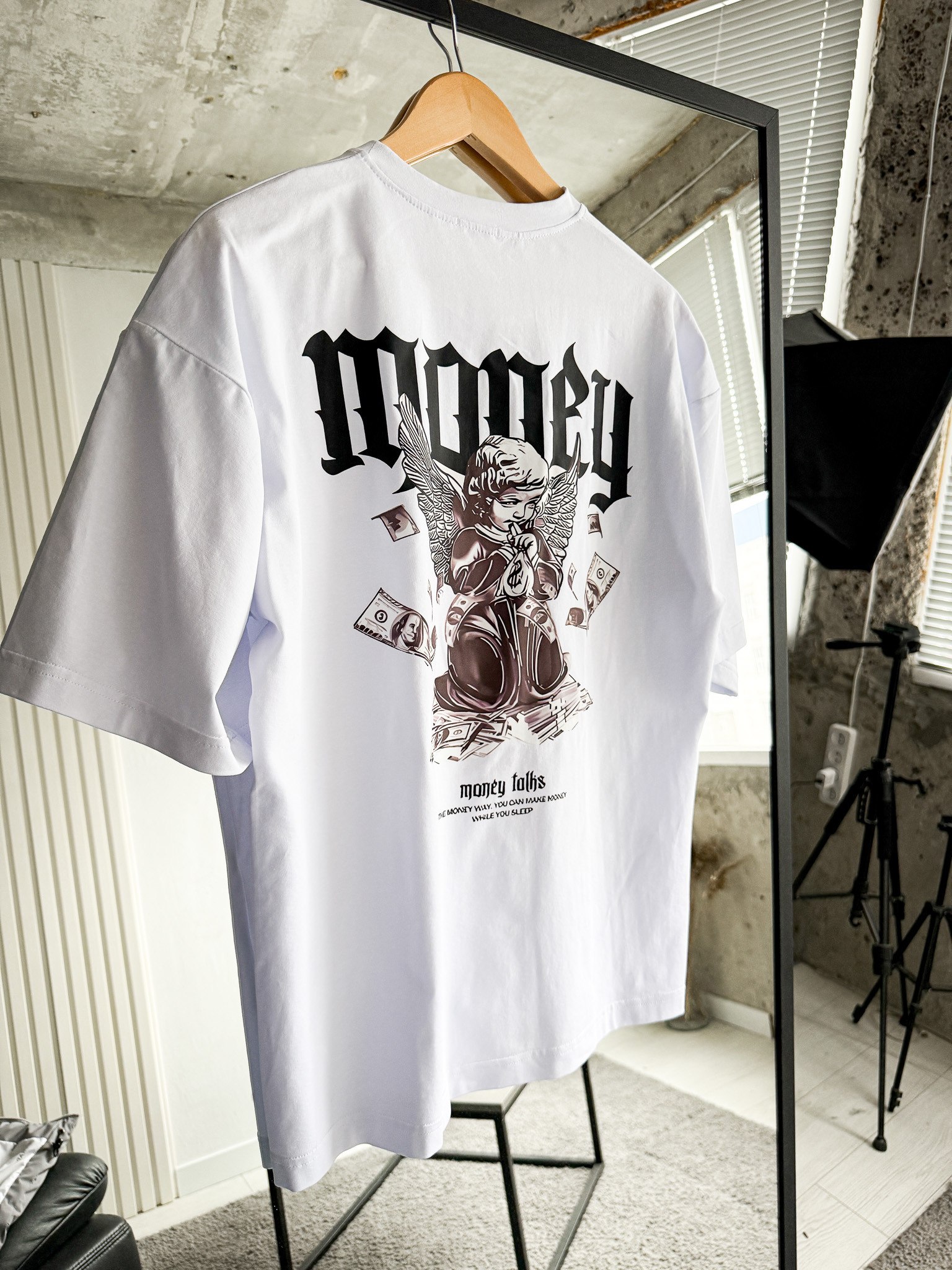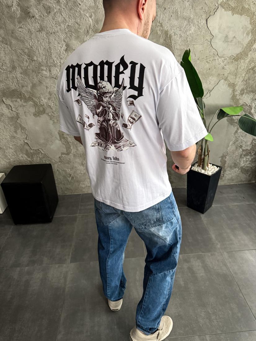 Мужская Белая Футболка Оверсайз Хлопок с Принтом Money на Спине
