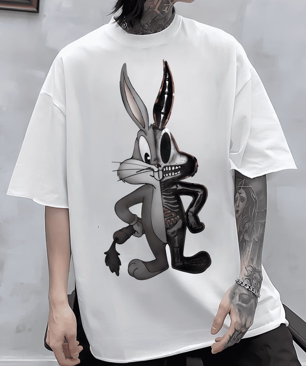 Мужская Белая Футболка Оверсайз Кулир с Принтом Багз Банни