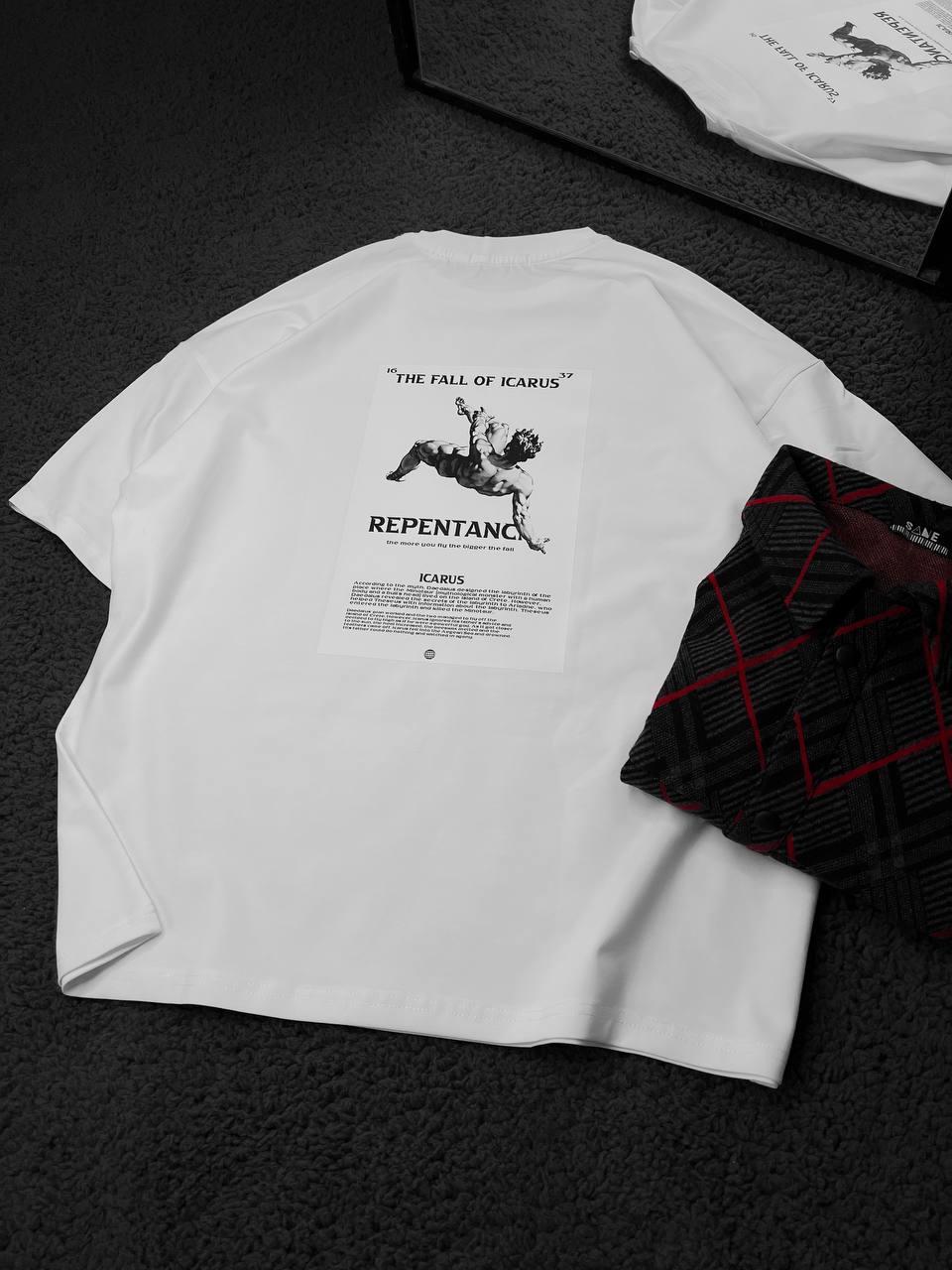 Мужская Белая Футболка Оверсайз – Плотная Кулир Принт Икарус