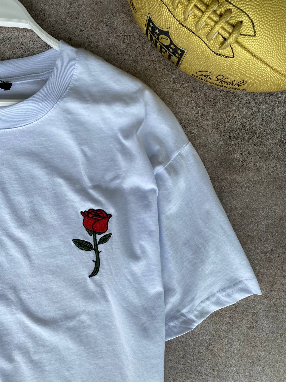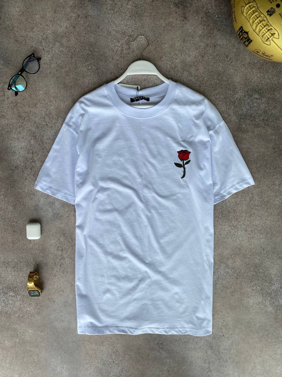 Мужская Белая Оверсайз Футболка – с Маленькой Вышивкой Розой на Груди