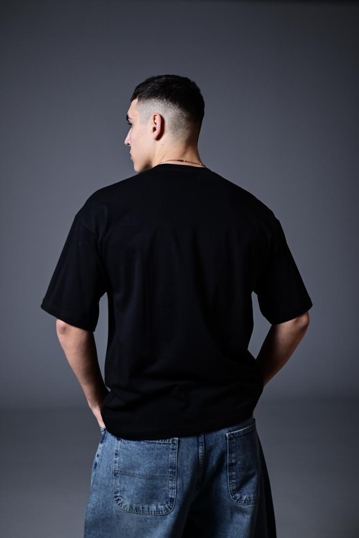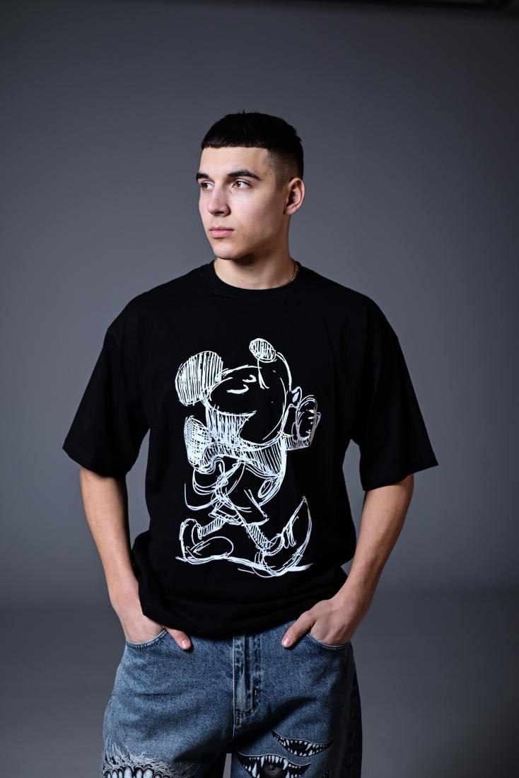 Мужская Черная Футболка Оверсайз Хлопок с Принтом Микки Маус на Спине