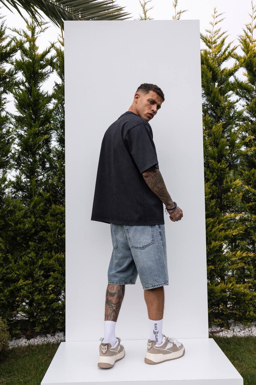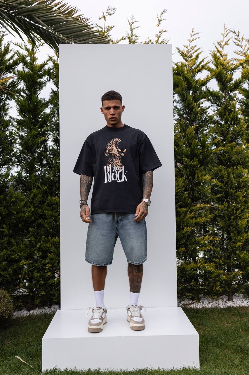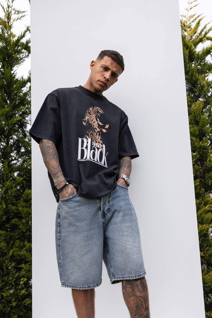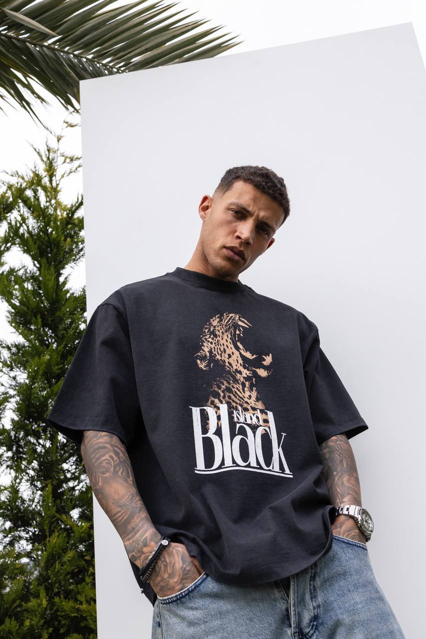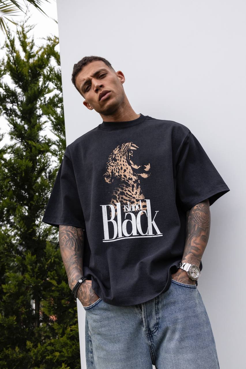 Мужская Хлопковая Черная Футболка Свободного Кроя с Принтом Гепард