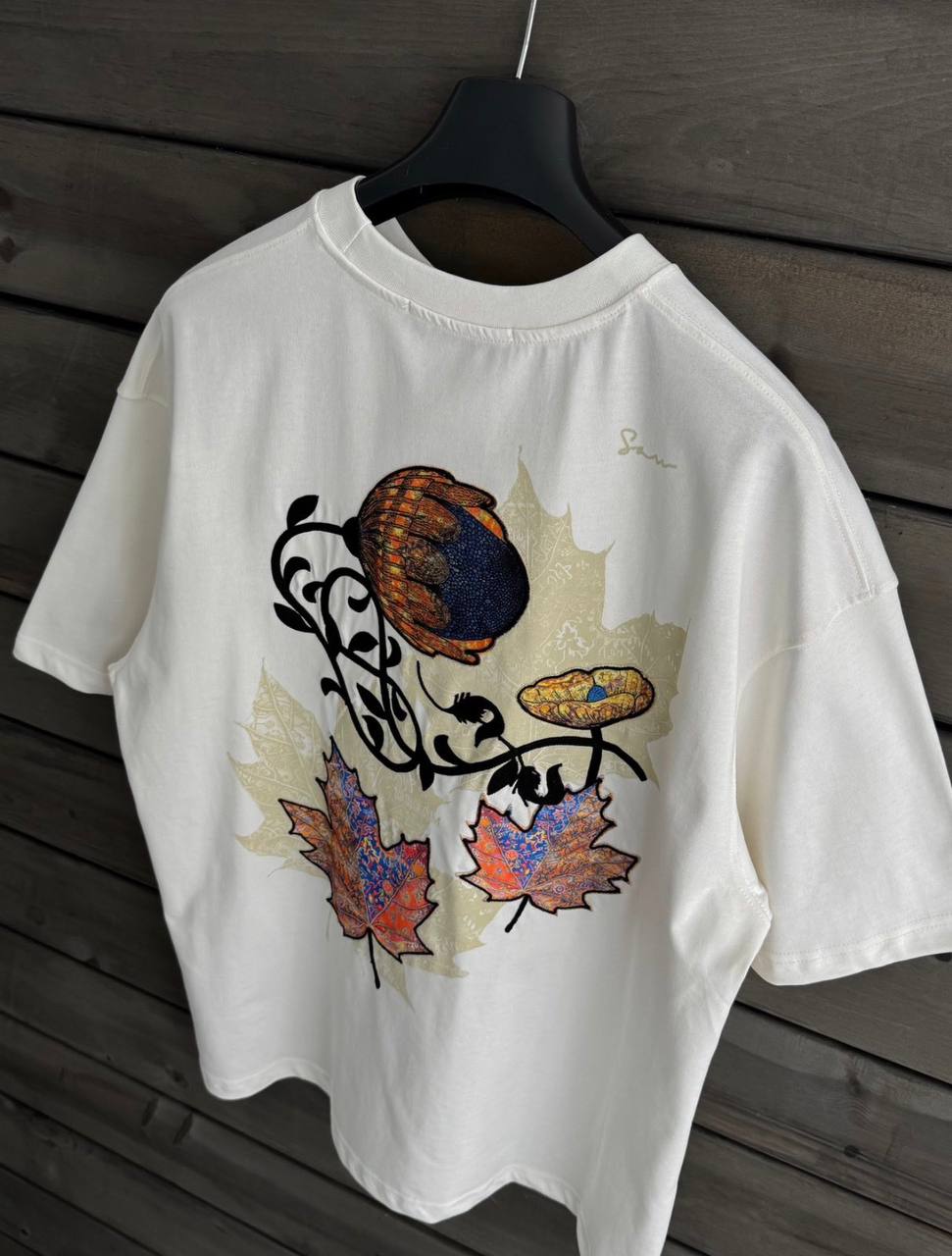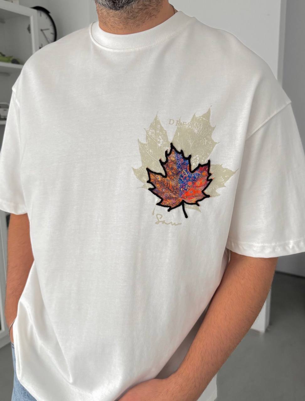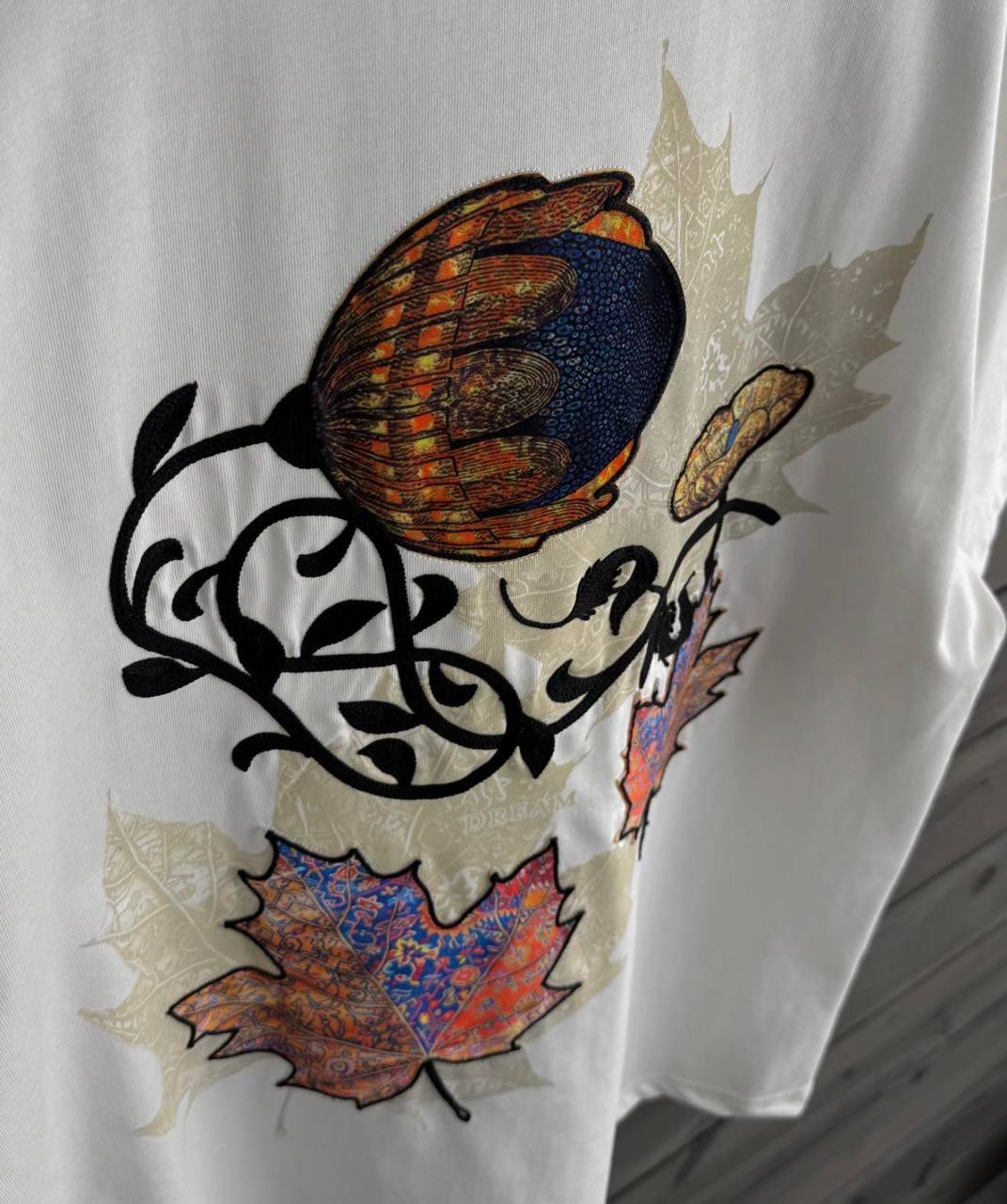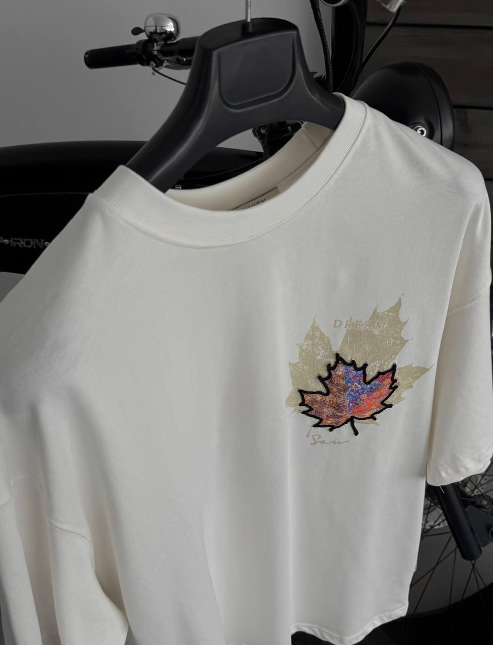 Мужская Хлопковая Молочная Футболка Оверсайз с Принтом и Вышивкой