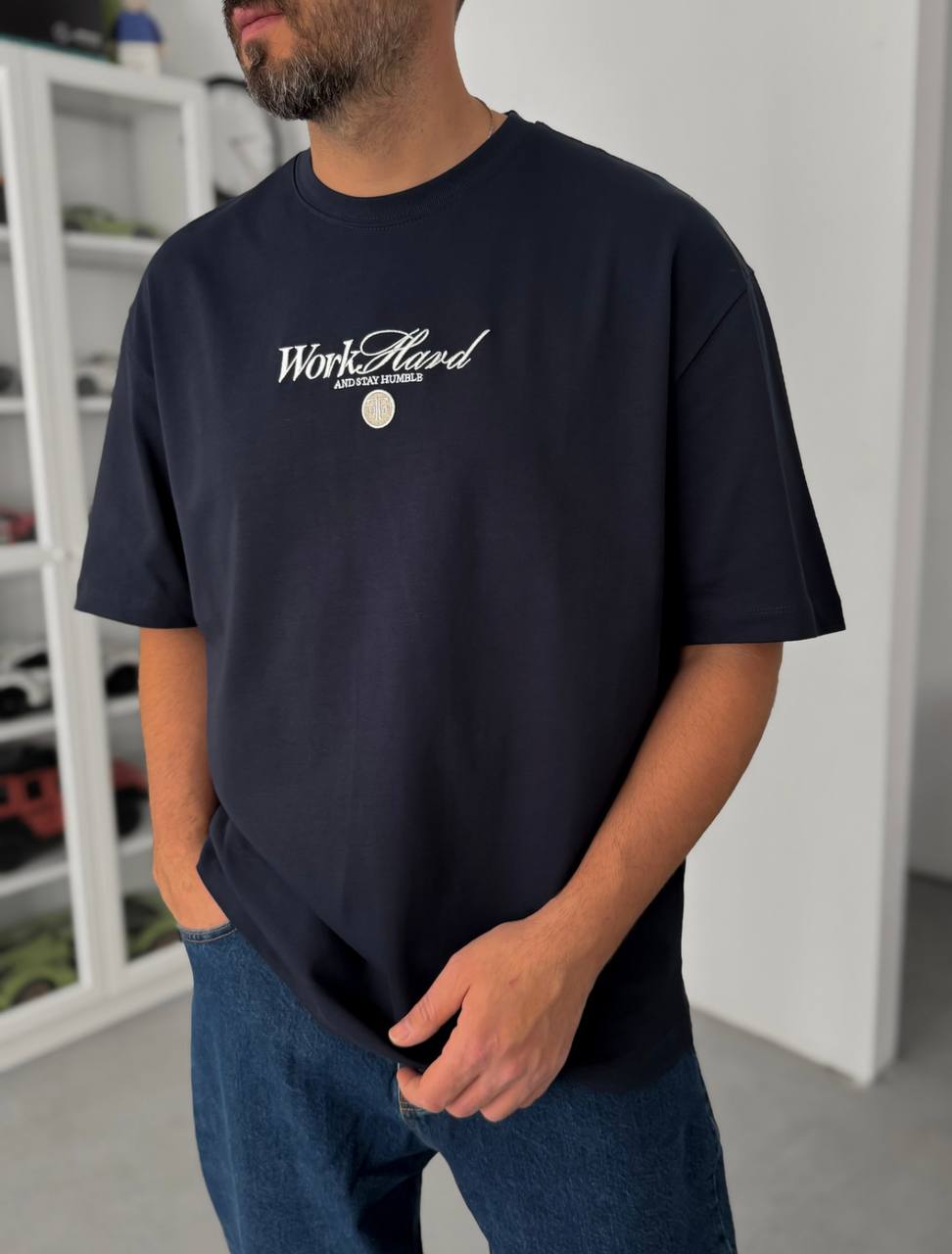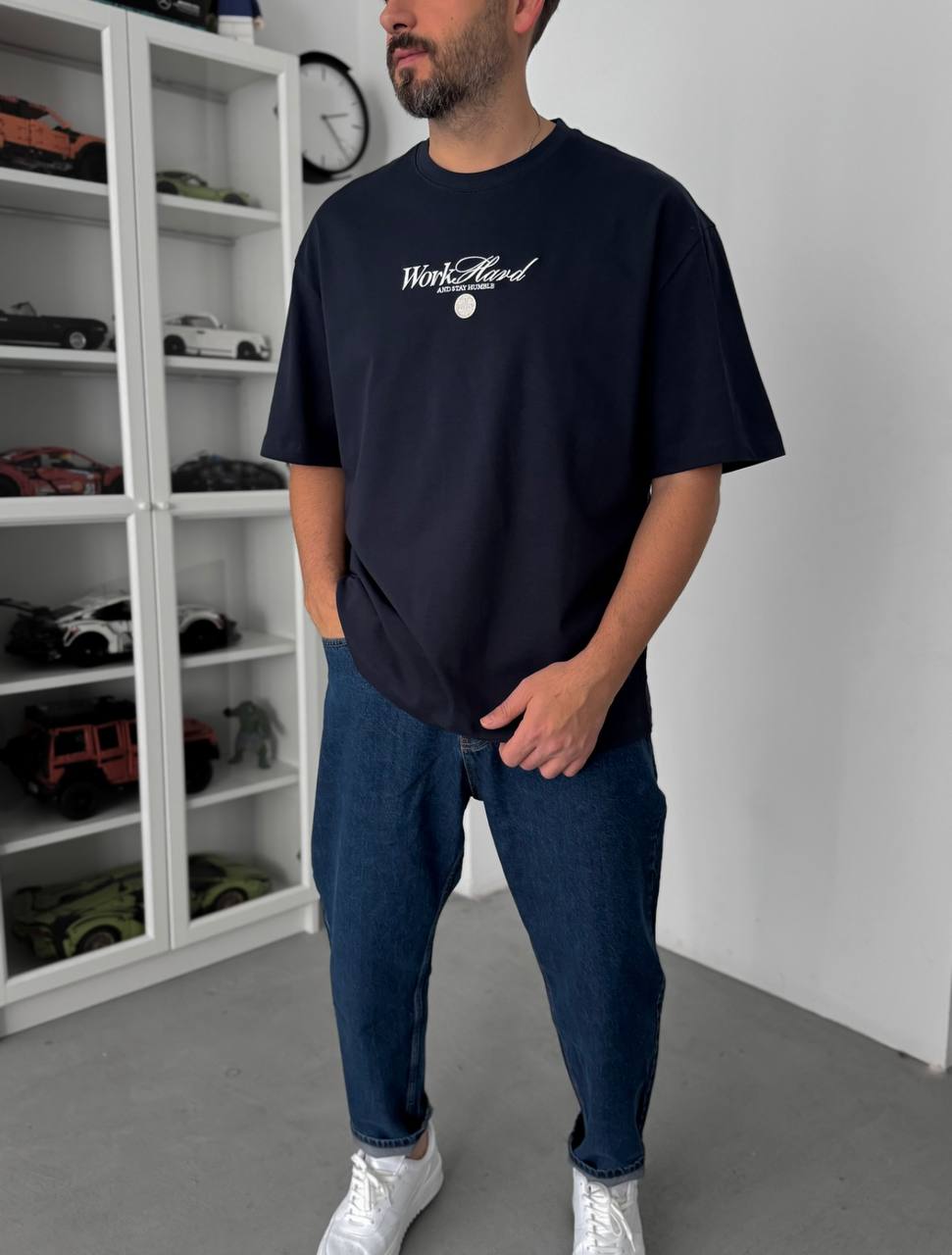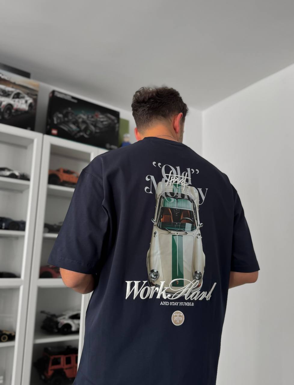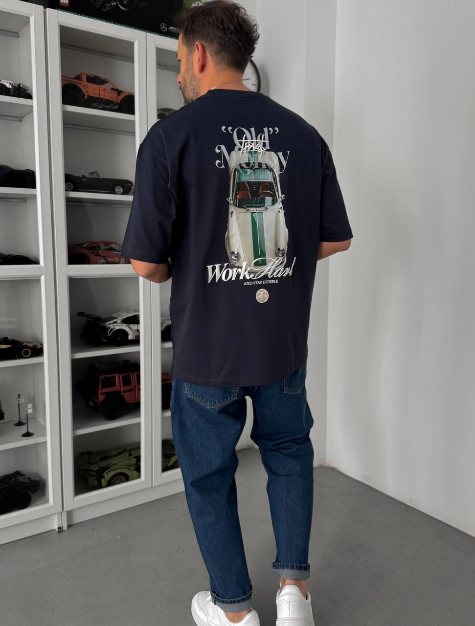 Мужская Хлопковая Темно-Синяя Футболка Оверсайз с Принтом “Old Money” на Спине