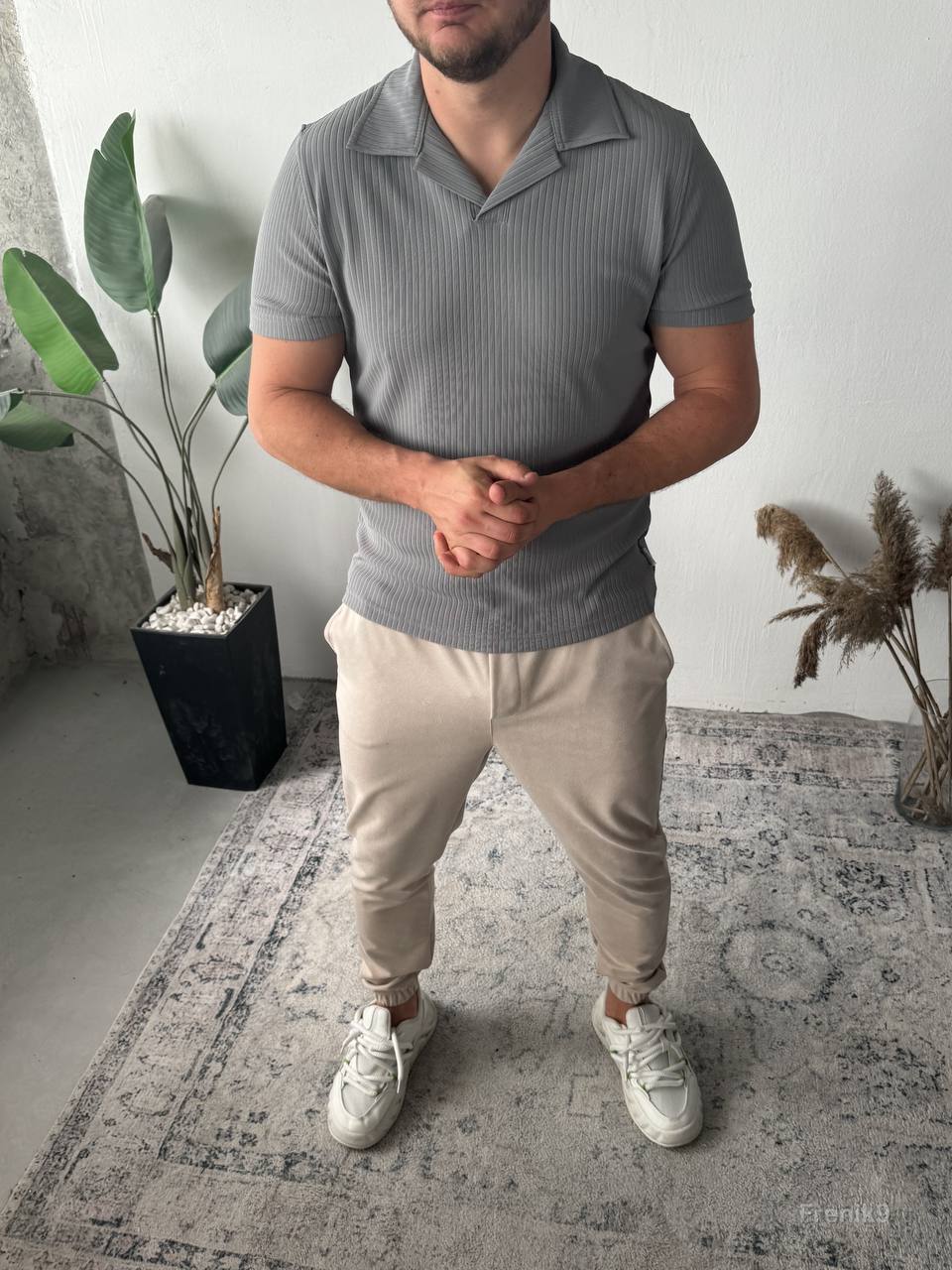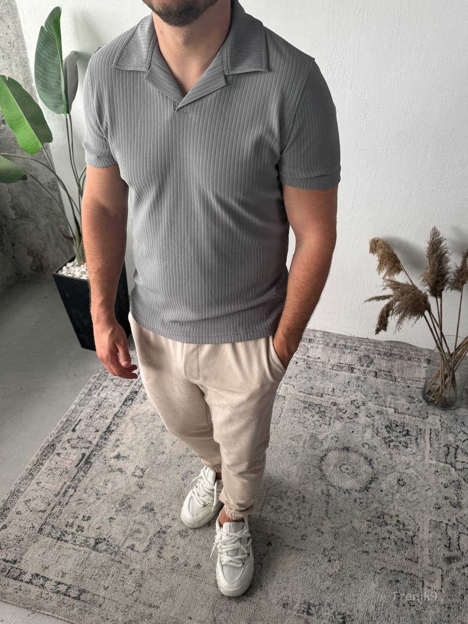 Мужская Классическая Серая Футболка Поло в Рубчик с Воротником