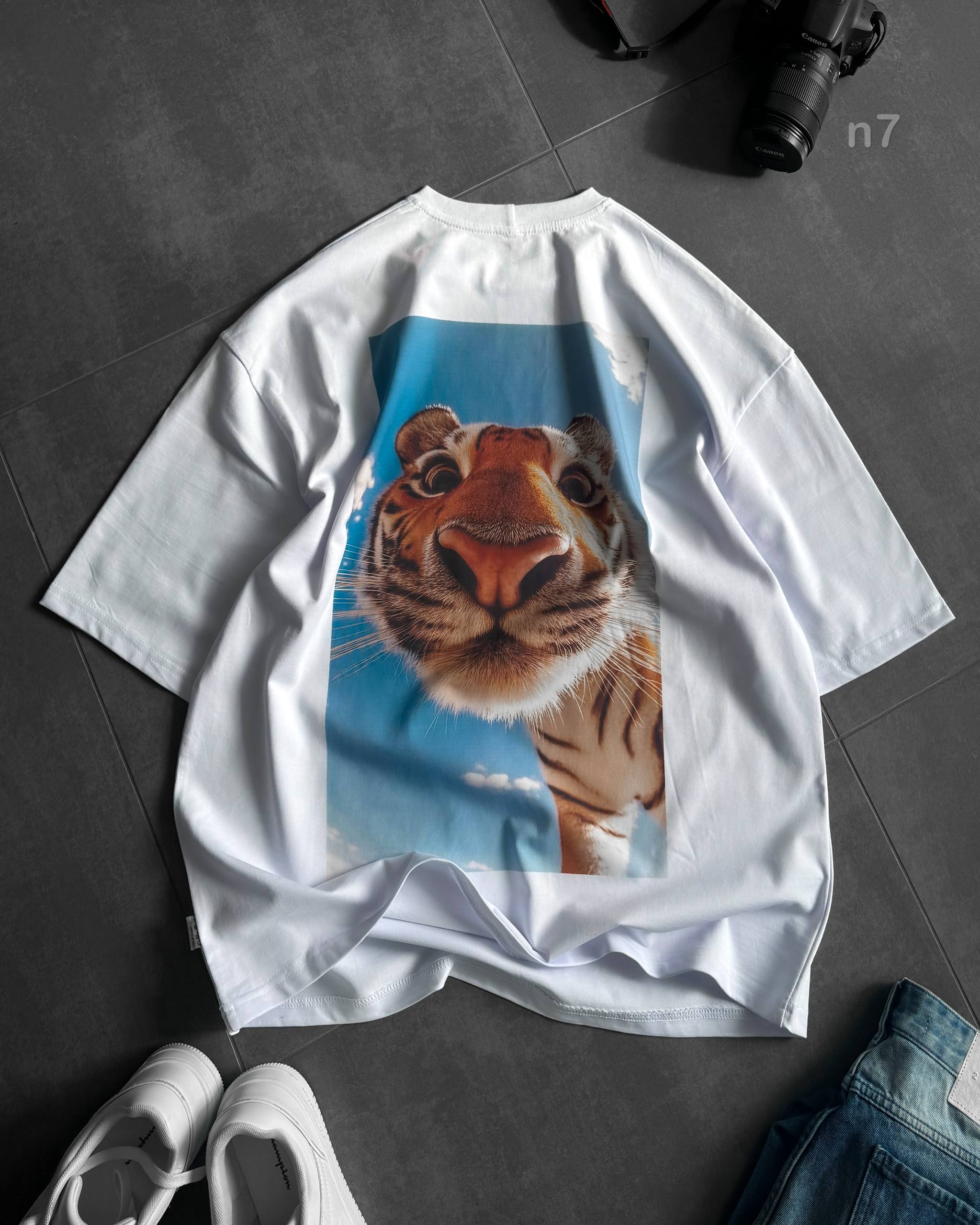 Мужская Летняя Белая Футболка Оверсайз – Объемная Хлопковая с Принтом Тигр на Спине