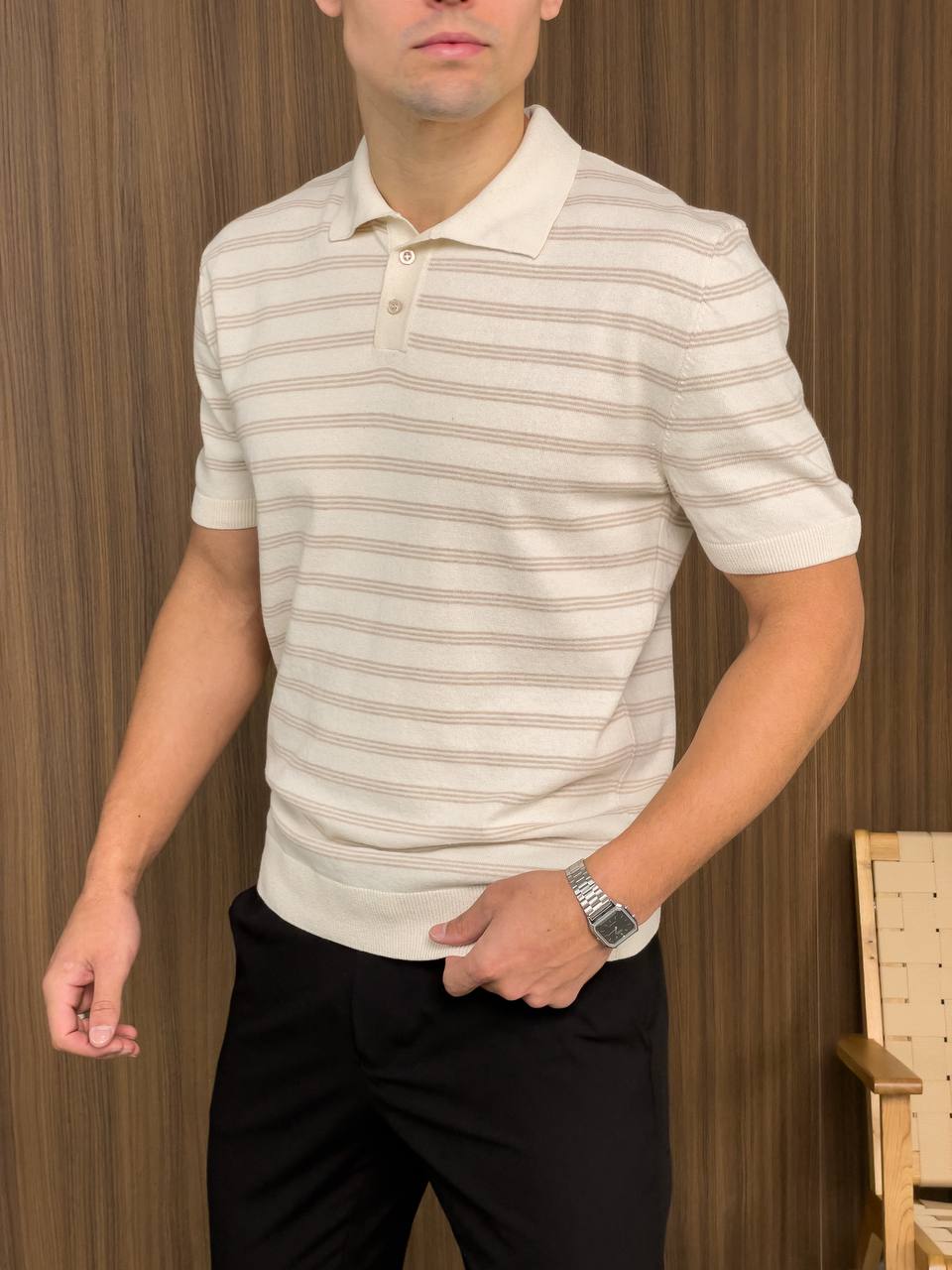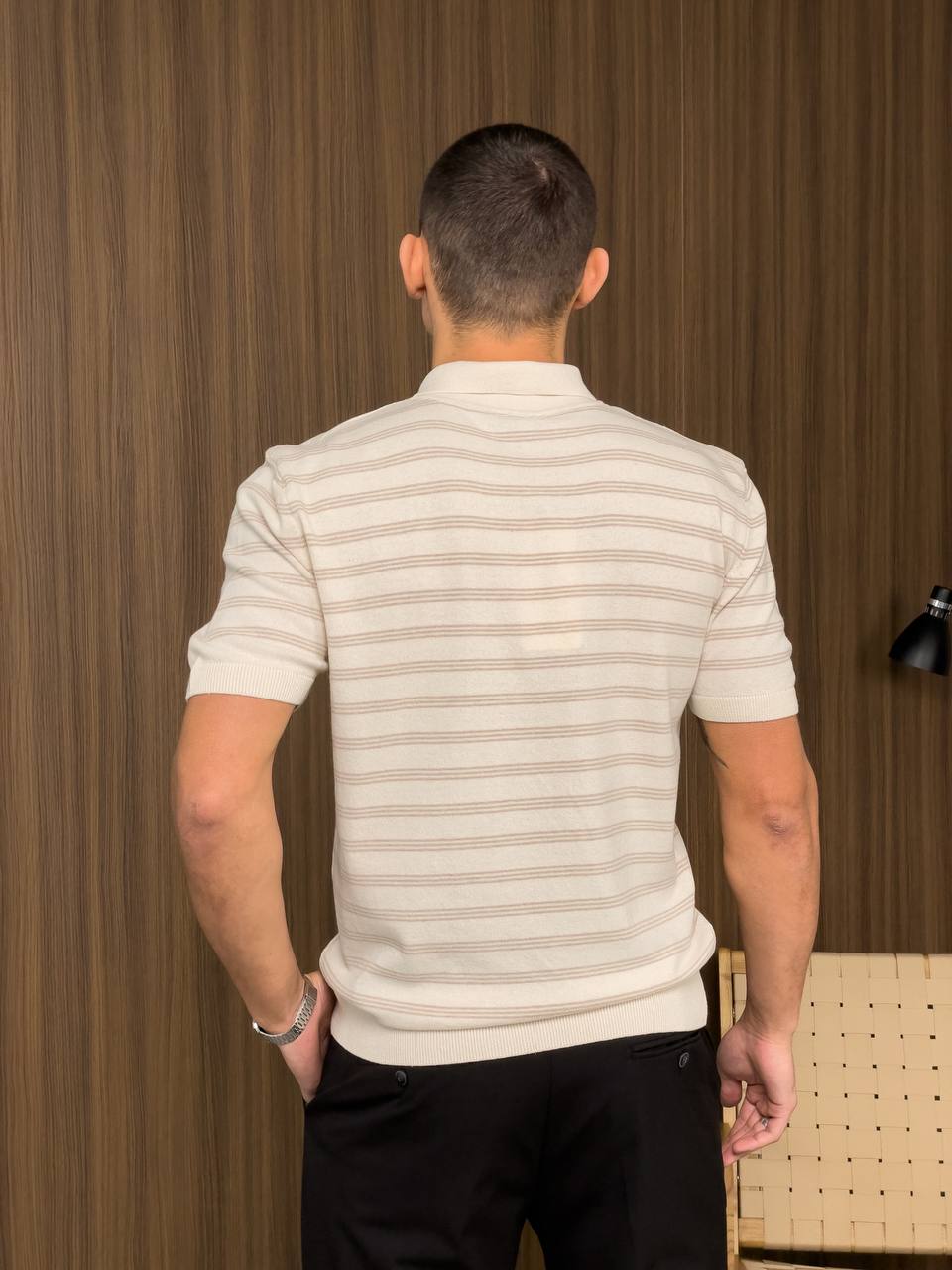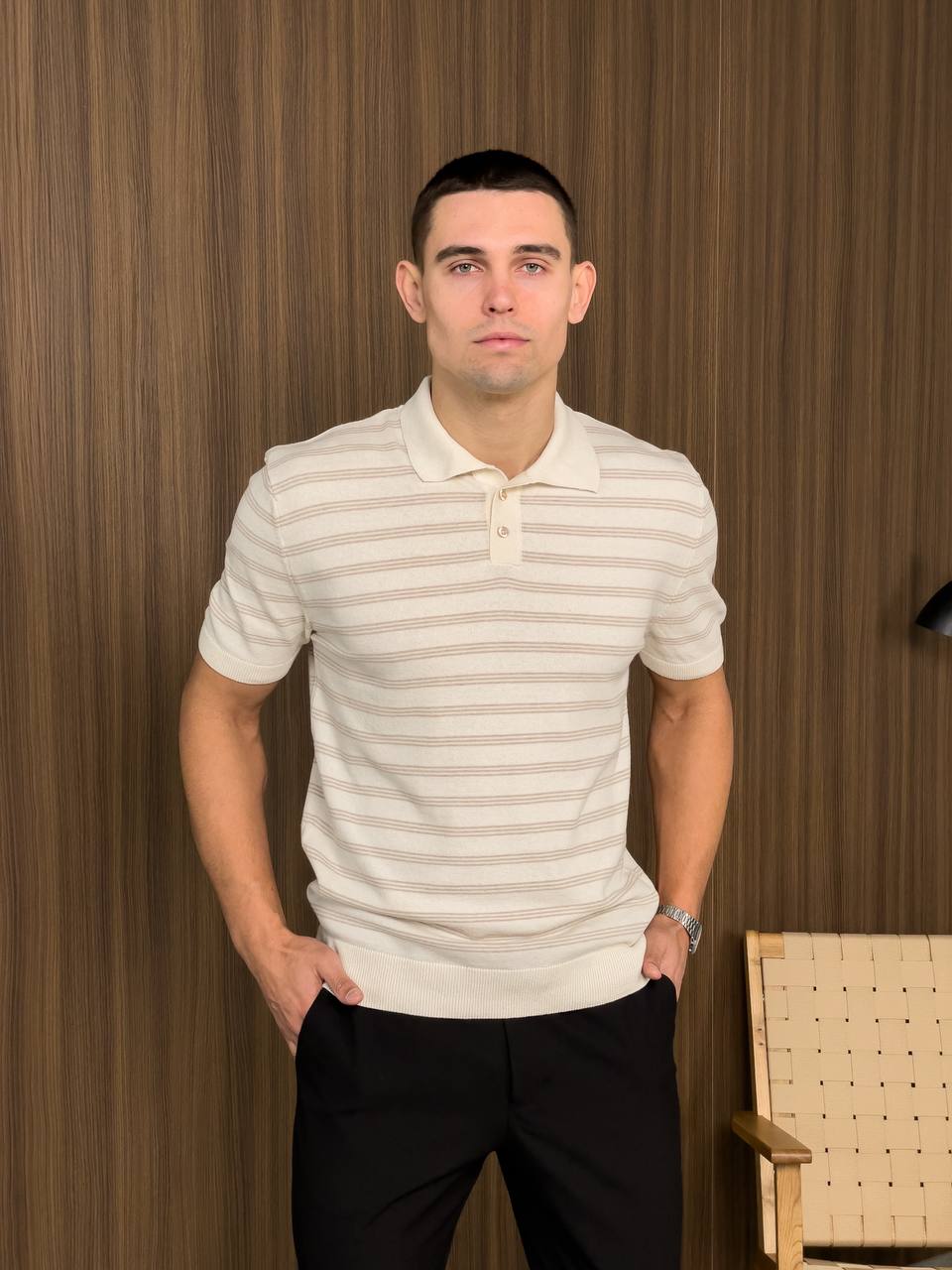 Мужская Полосатая Молочная Футболка с Воротником Поло – Тонкая Вязка