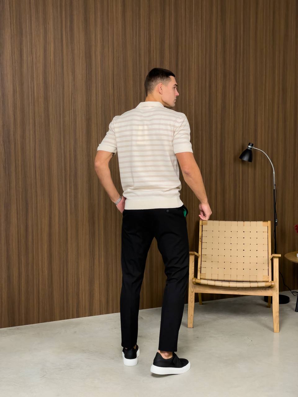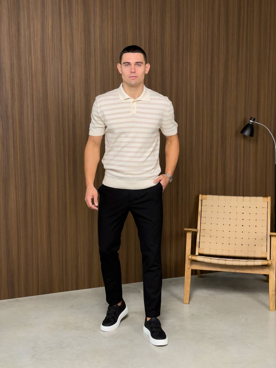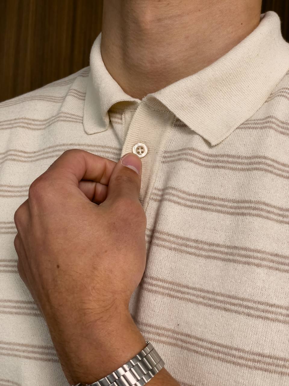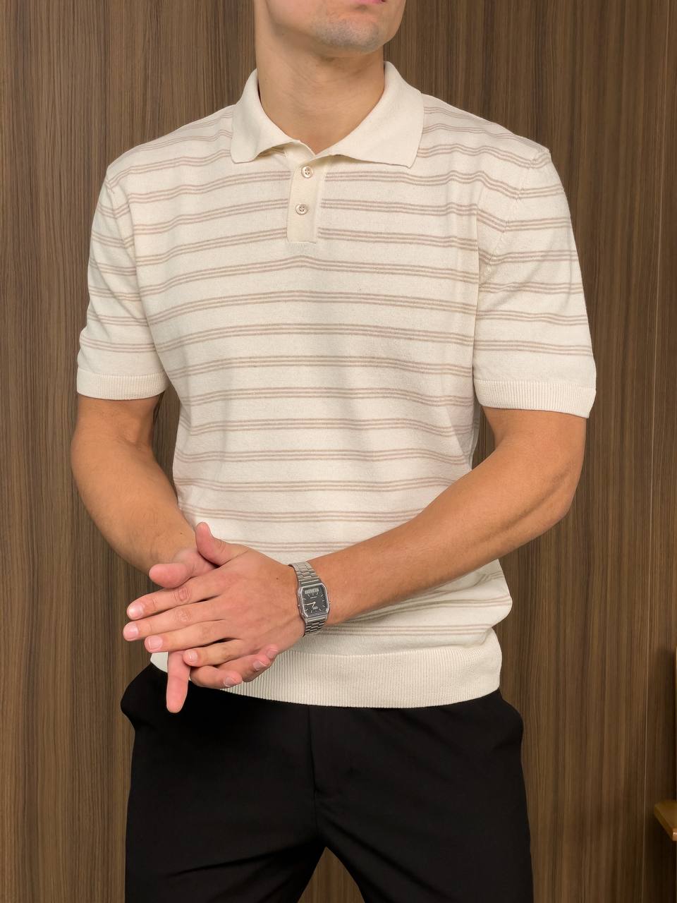 Мужская Полосатая Молочная Футболка с Воротником Поло – Тонкая Вязка