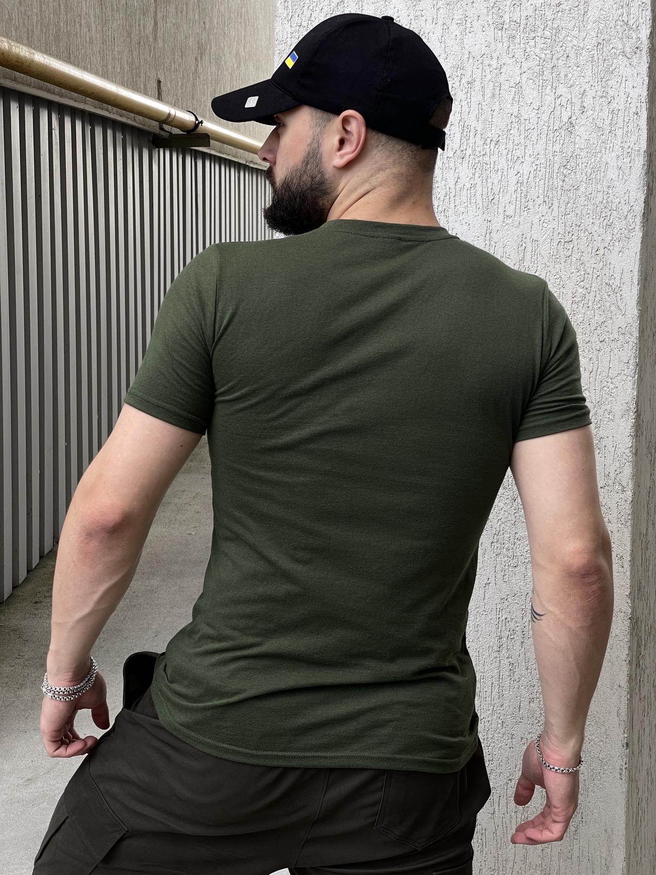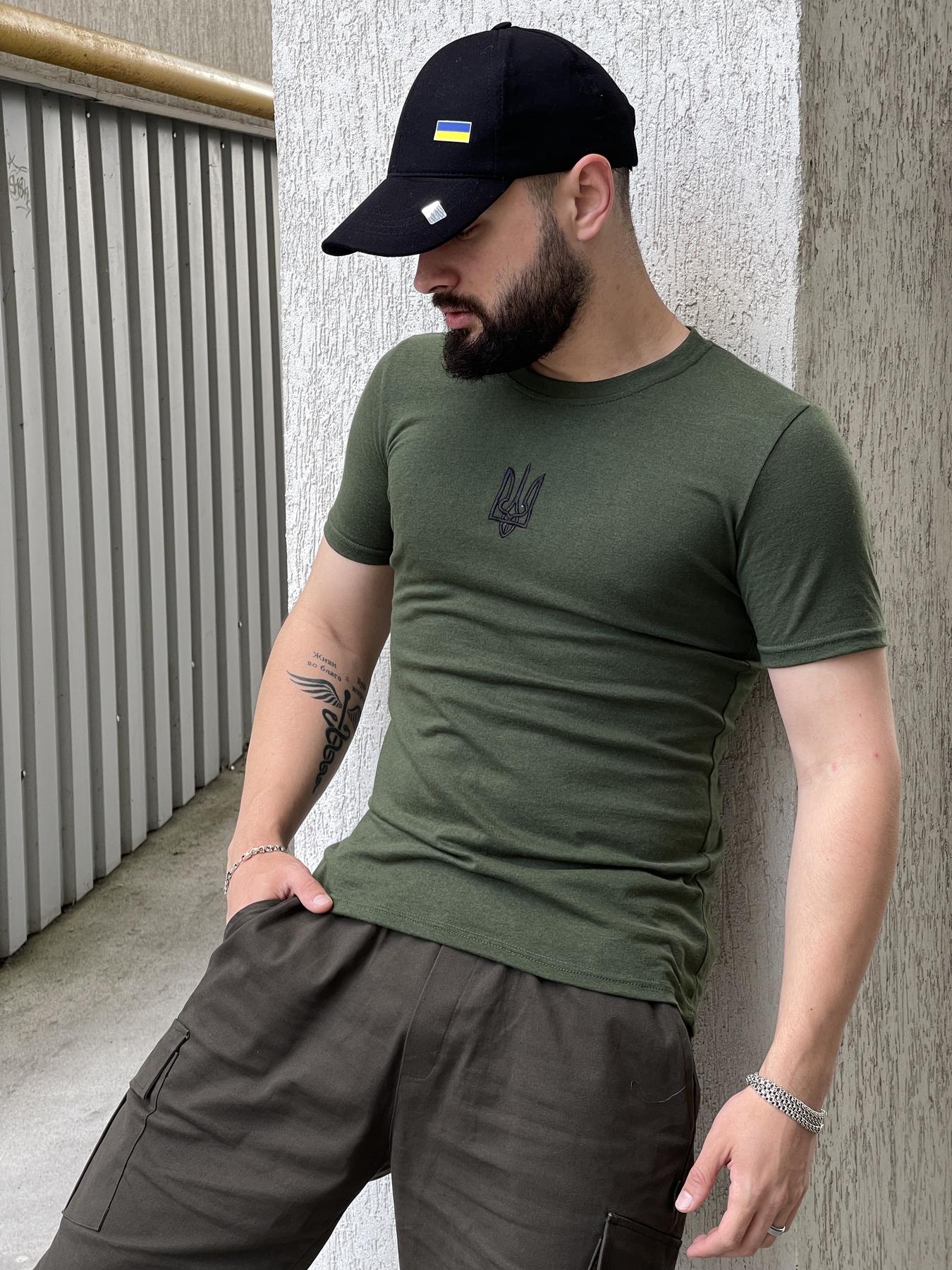 Мужская Приталенная Футболка Хаки с Круглым Вырезом и Вышитым Тризубом