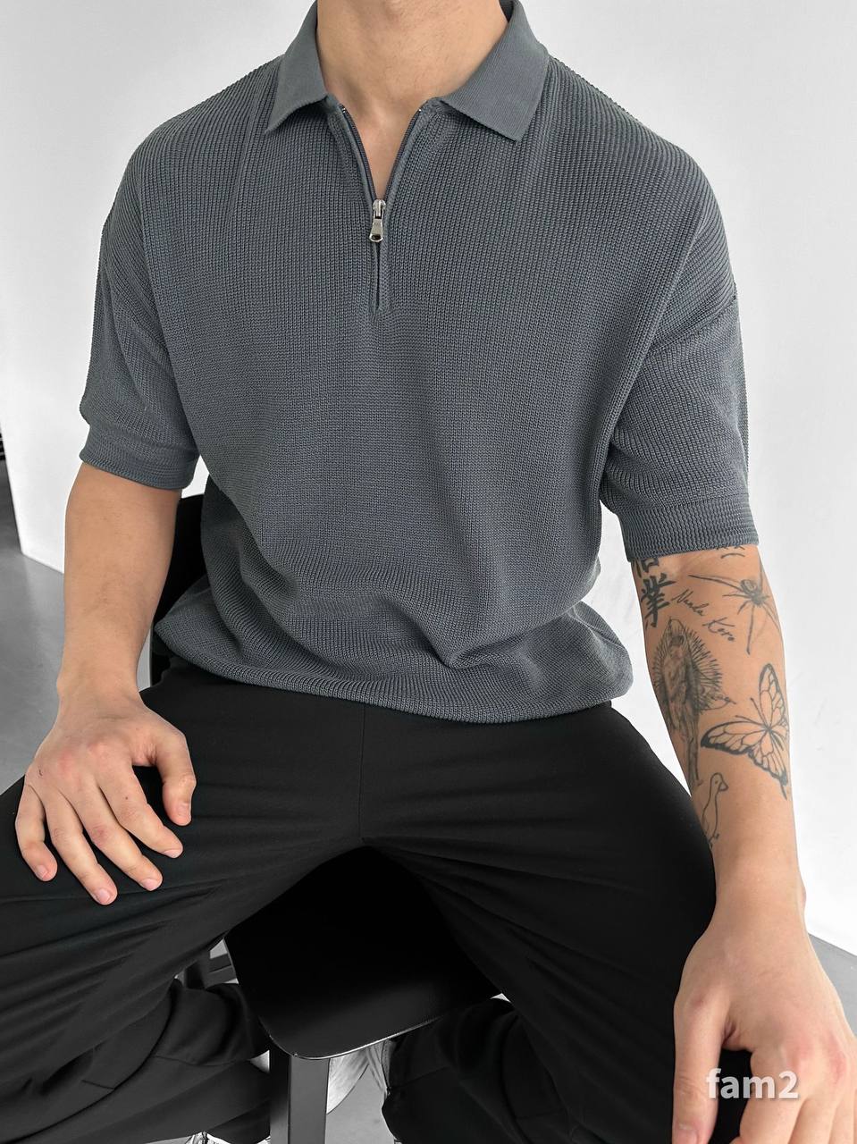 Мужская Свободная Базовая Графитовая Футболка Поло с Воротником на Змейке